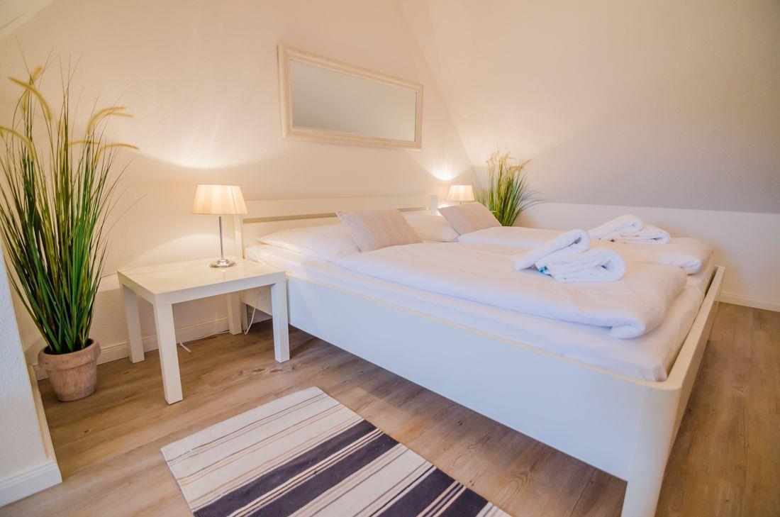 Die 2-Zimmer-Ferienwohnung "Westbrise", ruhig gelegen am Ende einer Sackgasse, befindet sich im 1 OG. einer Ferienwohnungs-Anlage. Der gemütliche Wohn- und Essbereich ist ausgestattet mit einem Essplatz, Sofa und TV. Von dort aus haben Sie Zugang zum Südwest-Balkon. In der offenen Küche (Kühlschrank, Mikrowelle, Geschirrspüler, Kaffeemaschine) lassen sich köstliche Mahlzeiten zubereiten. Auf der selben Ebene befindet sich das innen liegende Duschbad mit WC. Über eine Treppe gelangt man in das offen gestaltete Schlafzimmer mit Doppelbett. Weiter erwartet Sie hier ein kleiner, gemütlicher Erker wo sich eine kleine Leseecke mit einem Schreibtisch befindet. Hier können Sie in Ruhe lesen oder mit Ihrem Laptop im Internet surfen. Die WLAN-Nutzung steht unseren Gästen kostenlos zur Verfügung. Die zur Anlage gehörende Gemeinschaftssauna lädt vor allem in der kalten Jahreszeit zum Entspannen ein. Ebenfalls im Nachbargebäude stehen Ihnen eine Münz-Waschmaschine sowie ein Wäschetrockner zur Verfügung. Zu dieser Wohnung gehört zusätzlich eine Sonnenkuhle im Gemeinschaftsgarten (Strandkorb saisonal).