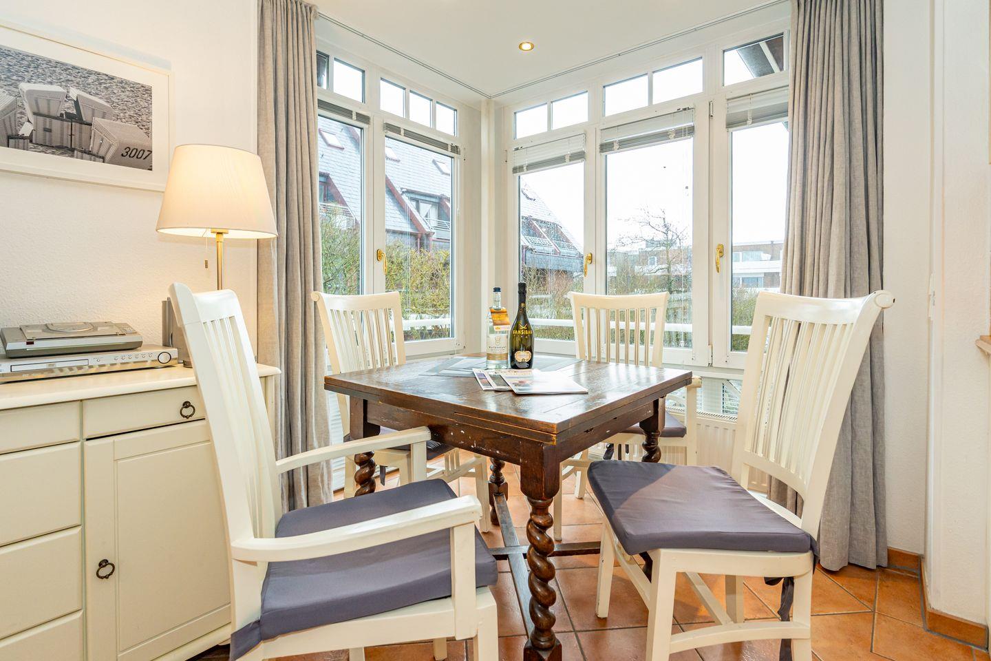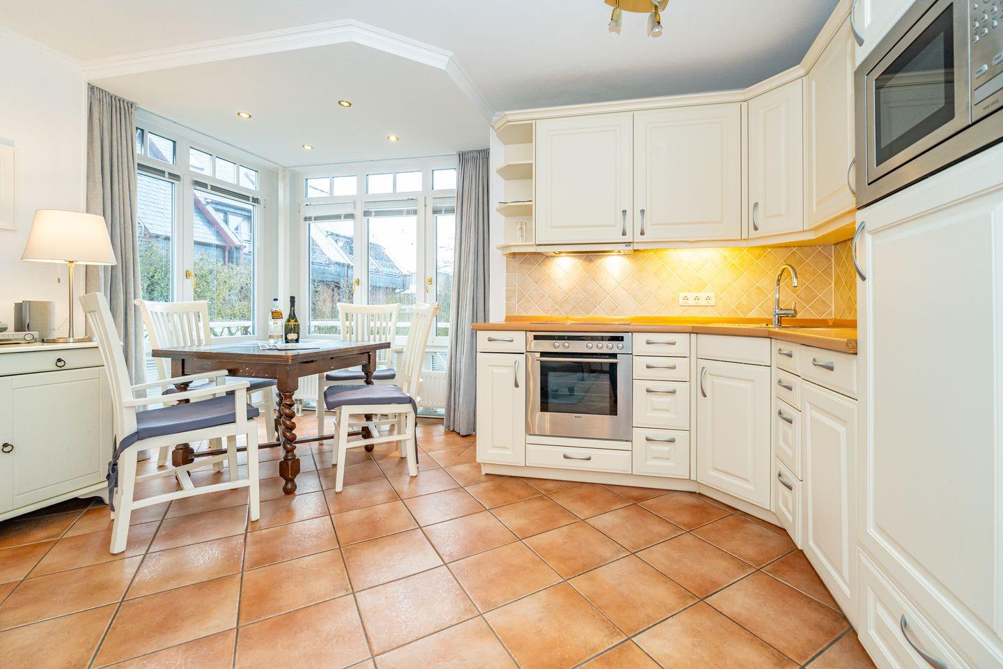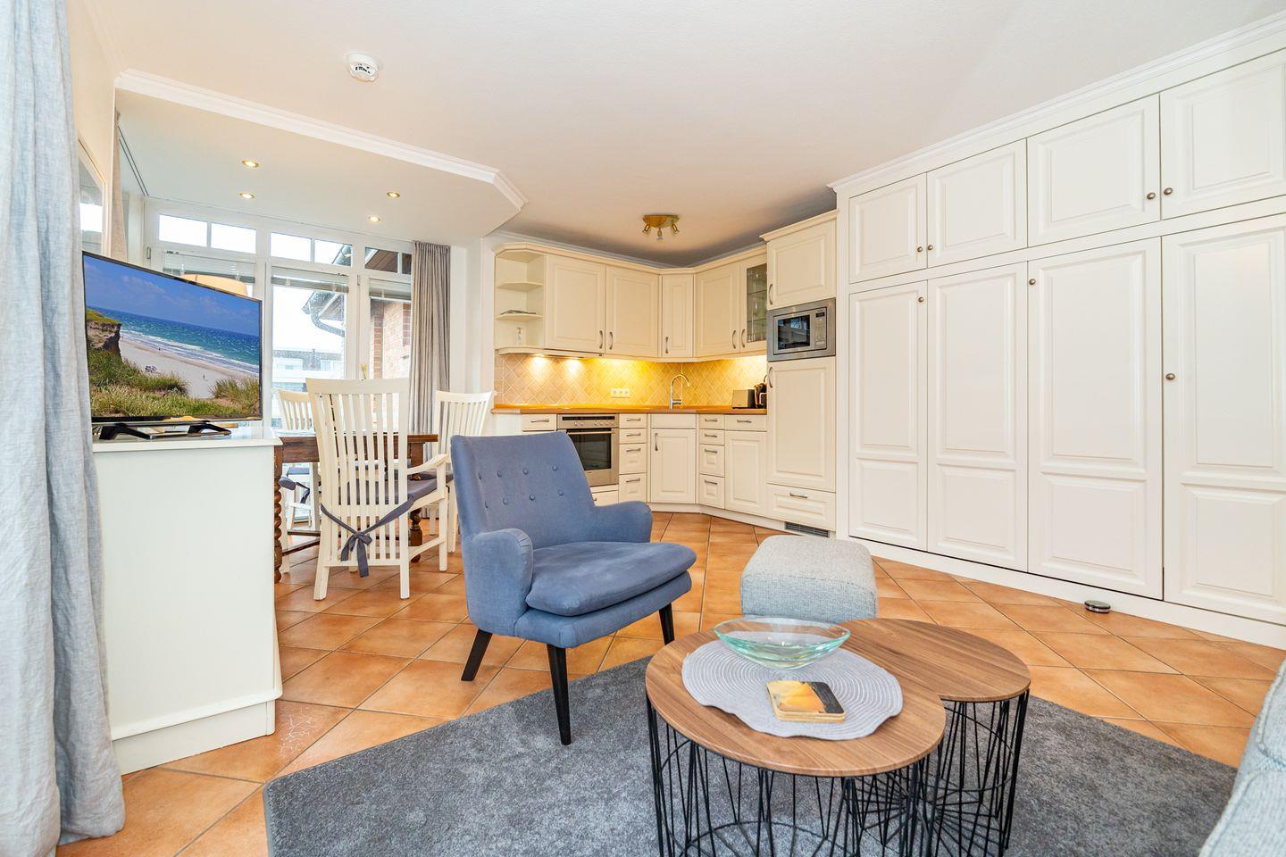 Eine zentral und dennoch ruhig gelegene Ferienwohnung am Wenningstedter Dorfteich. Der Wohnbereich der Ferienwohnung im 1. OG überzeugt mit seinem gemütlichem Sofa und Sessel, sowie Flat-TV. Er geht direkt über in den Essbereich in einem südlich ausgerichteten Glaserker, welcher perfekt geeignet ist, den Tag bei einem entspannten Frühstück zu beginnen. Die daneben liegende offene Küchenzeile bietet von einer Mikrowelle, über einen Backofen, bis hin zum Geschirrspüler alles, was man braucht. Vom Wohnbereich aus haben Sie Zutritt zum östlich ausgerichteten Balkon. Das Schlafzimmer bietet neben dem komfortablen Doppelbett genug Schrankfläche und ebenfalls Zutritt zum Balkon. Von dort aus haben Sie einen wunderschönen seitlichen Blick auf den Wenningstedter Dorfteich und die sehenswerte Friesenkapelle. Das Duschbad mit WC und Handtuchheizung ist lichtdurchflutet und komfortabel. Im Wohnzimmer steht ein weiterer Doppelschrankbett mit weiterem Stauraum bereit.