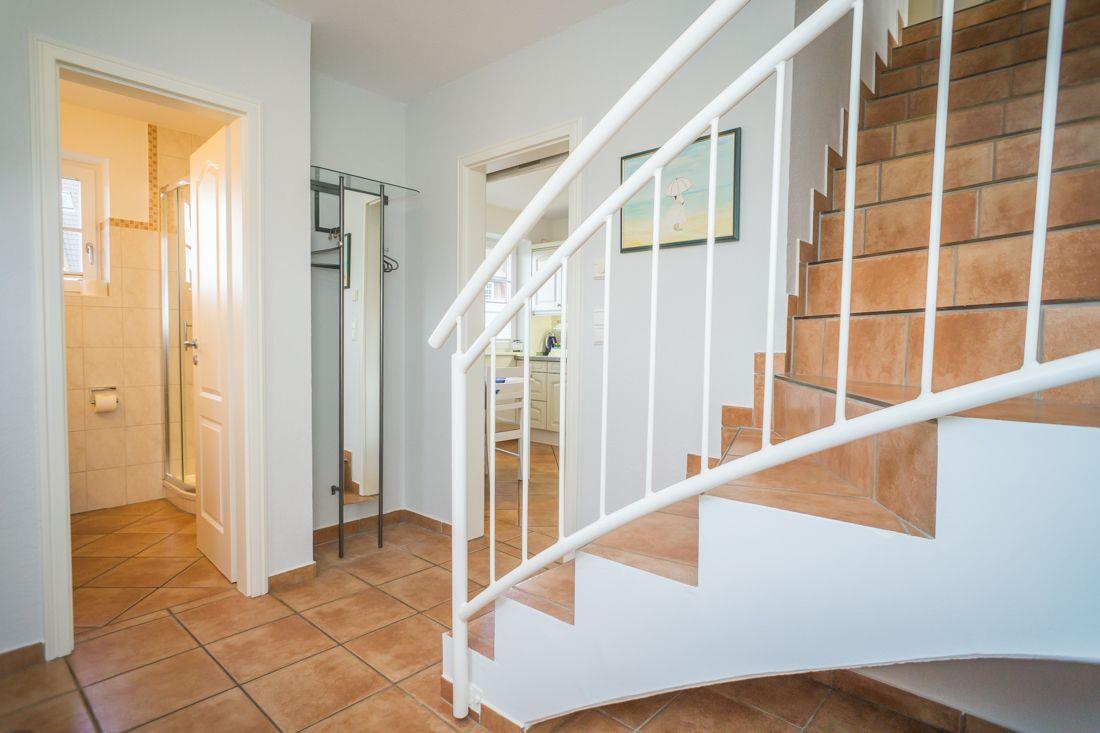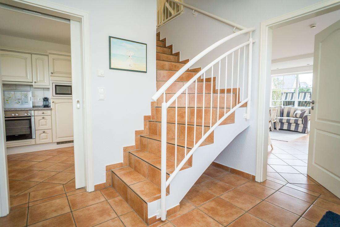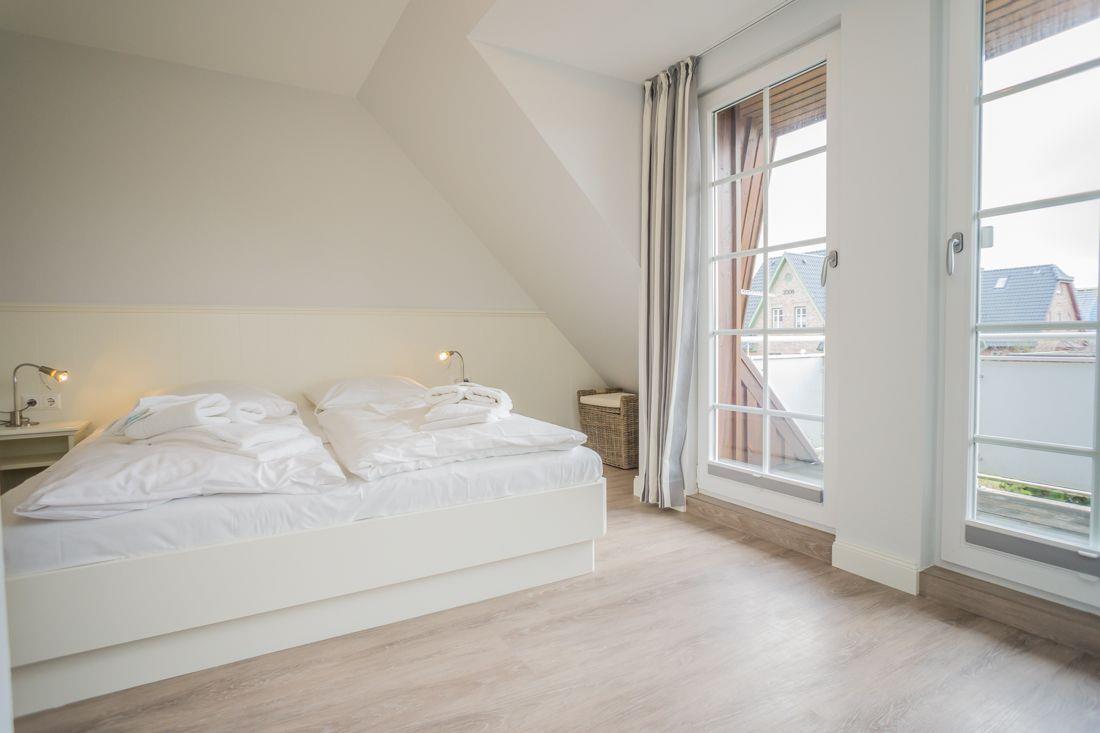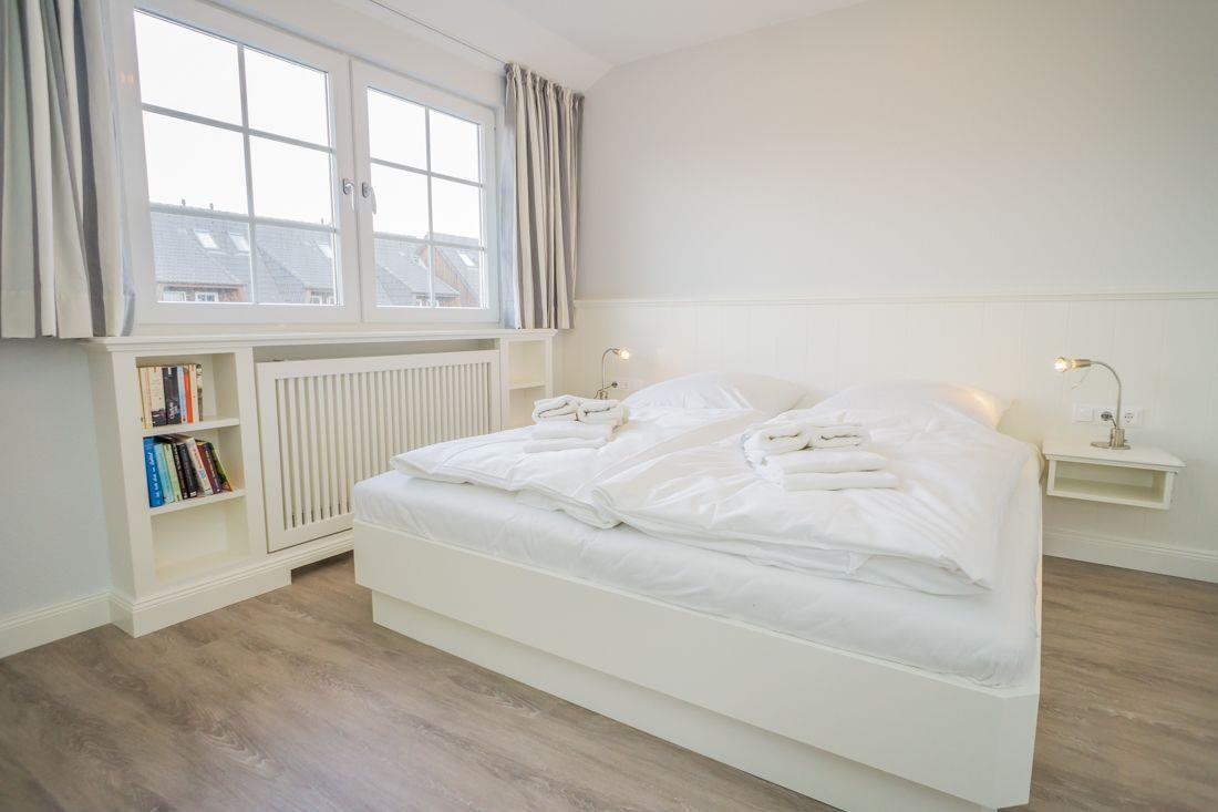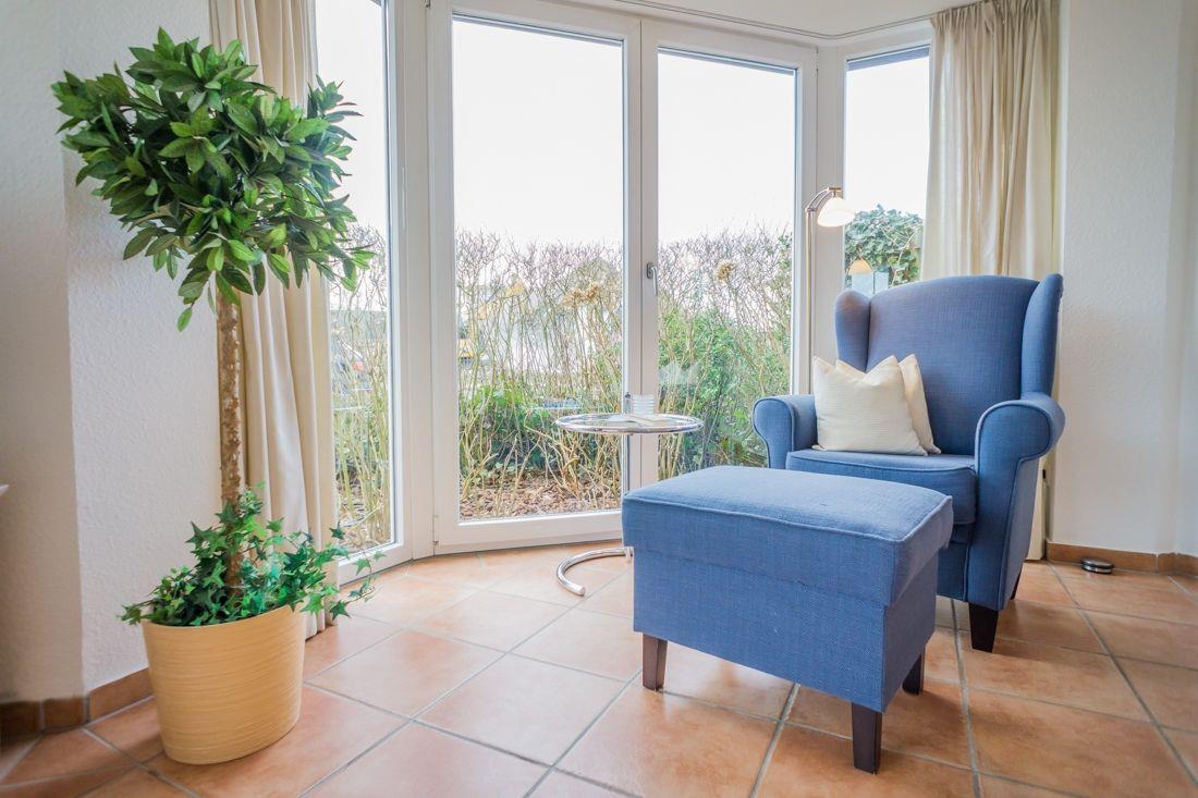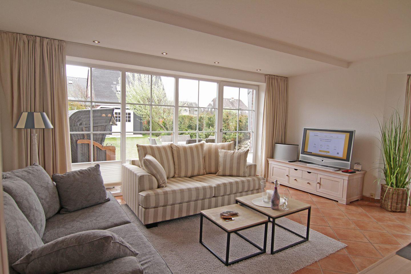 Vom Eingangsbereich mit Garderobe gelangen Sie in das lichtdurchflutete und großzügige Wohn- / Esszimmer mit zwei einladenden großen Sofas, Flatscreen, DVD-Player, Stereoanlage und Essecke. Von hier haben Sie Zutritt zur Süd-Terrasse mit Garten und Bestuhlung. Hier können Sie im vorhandenen Sylter Strandkorb bei einem Glas Wein den Sonnenuntergang genießen. Im Erdgeschoss liegen zudem das Duschbad mit WC, die separate, vollausgestattete Küche (Airfryer, Spülmaschine, Backofen, Ceranfeld, Kühlgefrierkombi, Nespresso-Maschine) und ein Hauswirtschaftsraum mit Waschmaschine & Trockner. Über die Treppe gelangen Sie ins 1. OG, wo Sie zwei Schlafzimmer mit je einem Doppelbett (180 x 200 cm) und Flatscreen vorfinden. Das Schlafzimmer Richtung Süden, verfügt zudem über einen herrlich sonnigen Balkon mit passenden Möbeln.