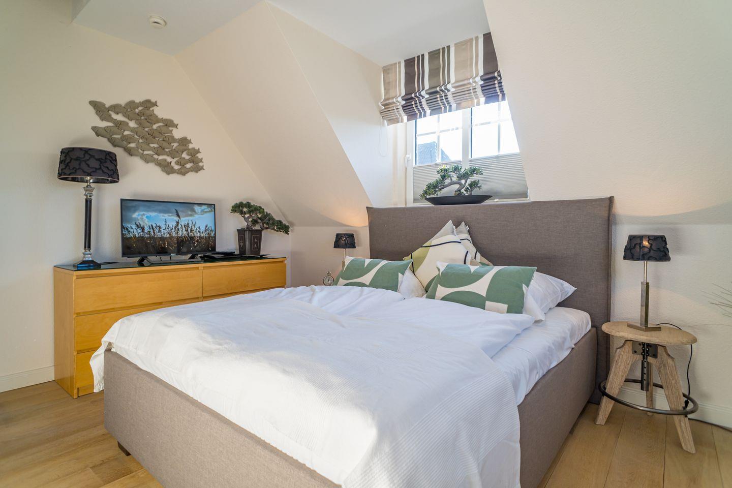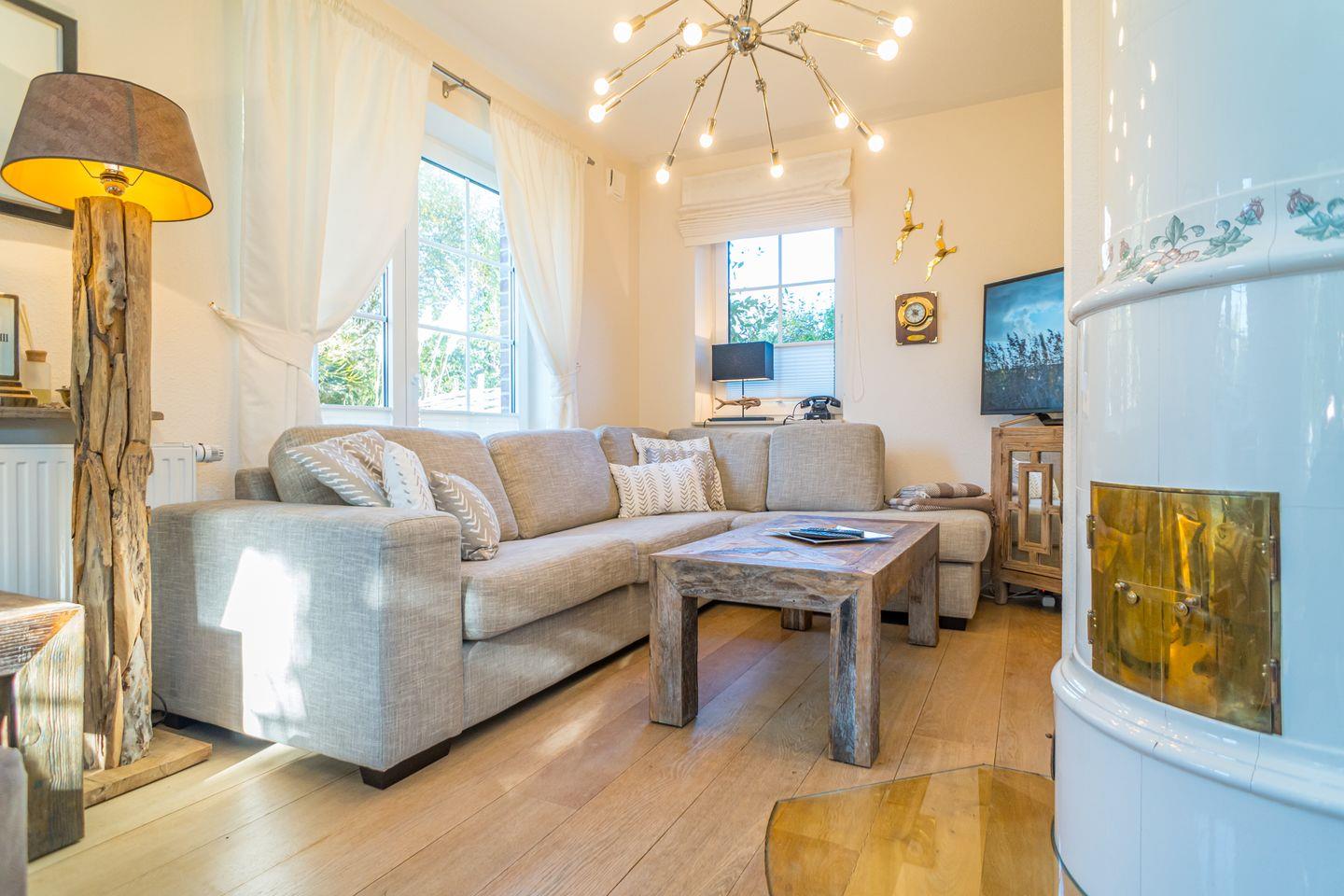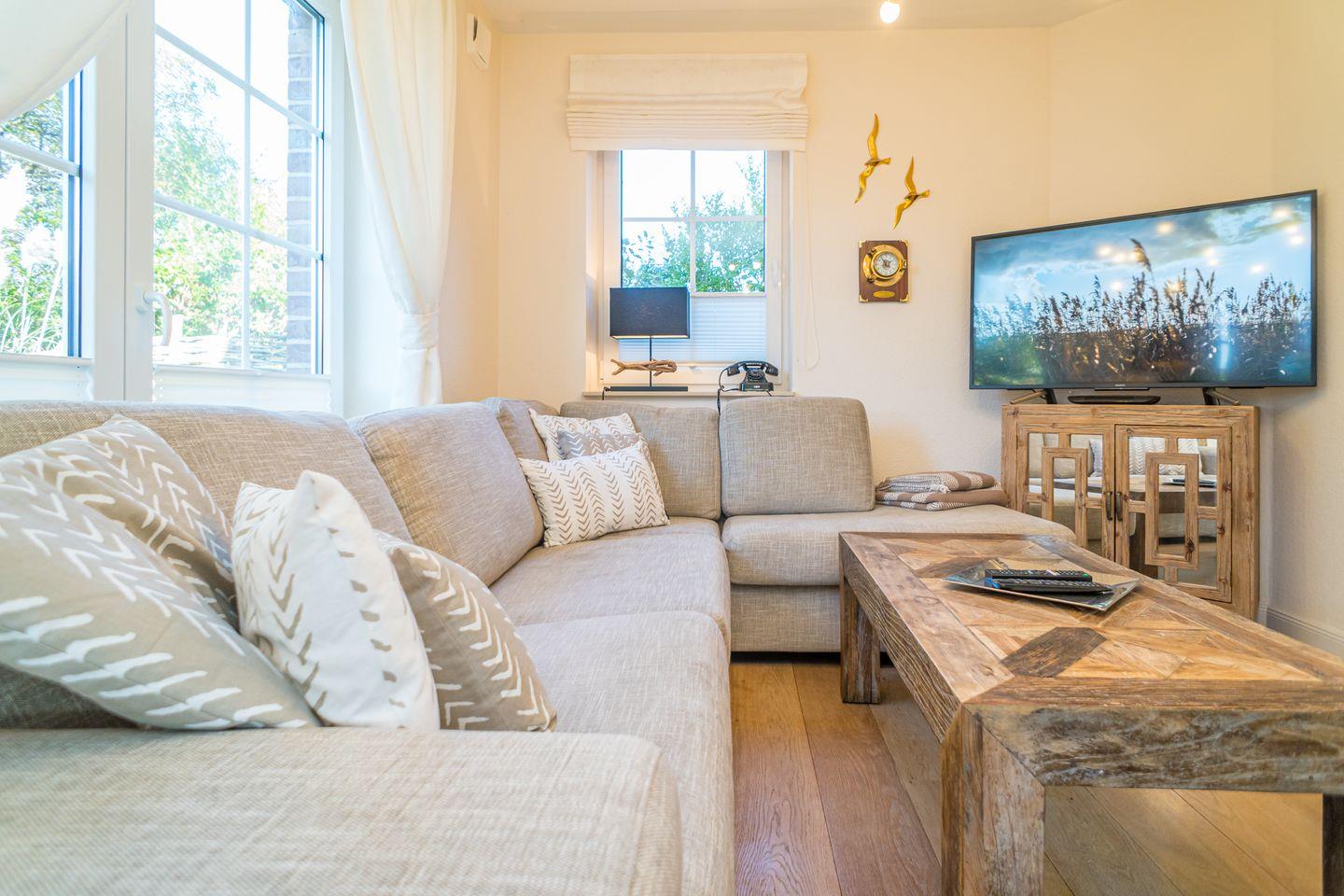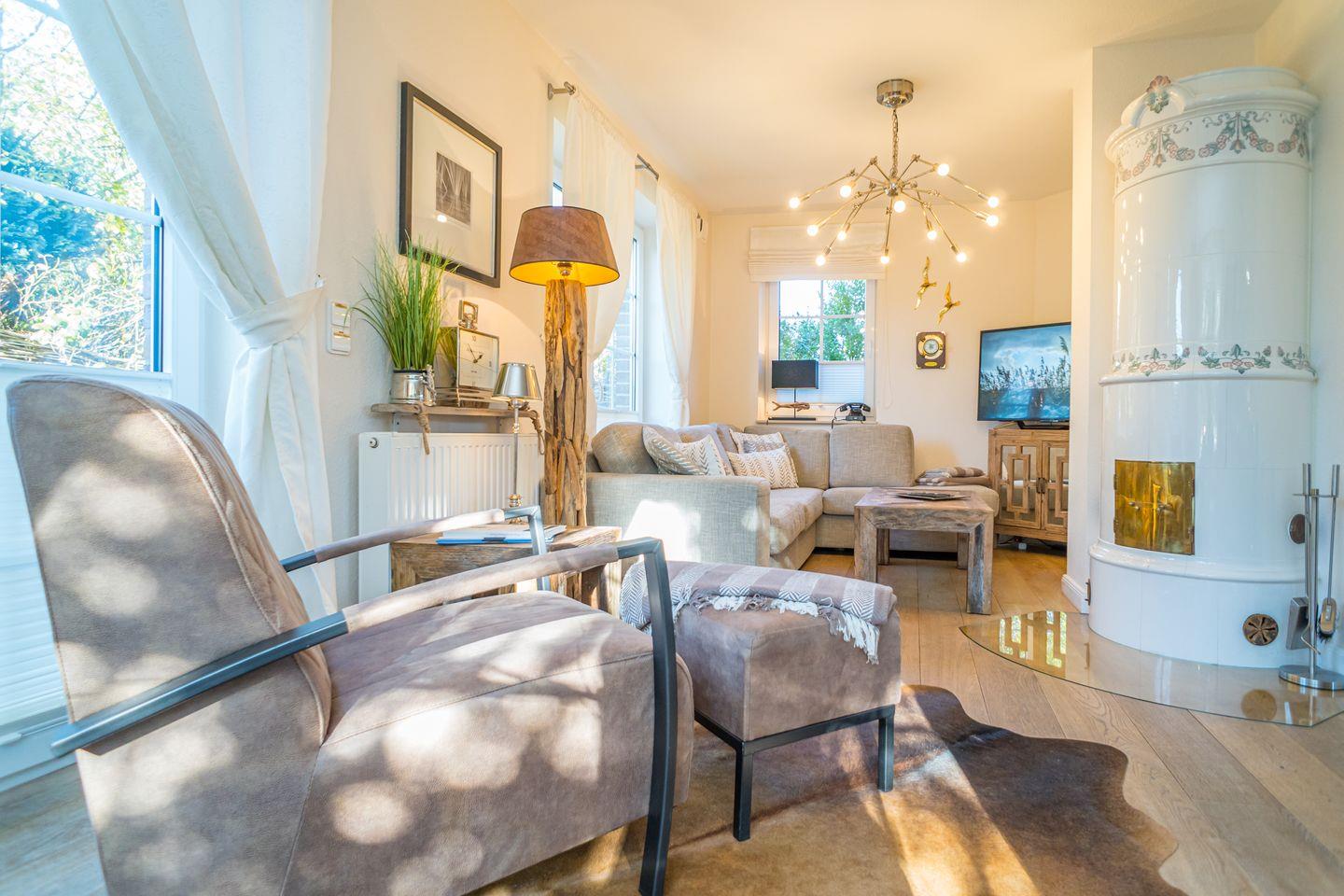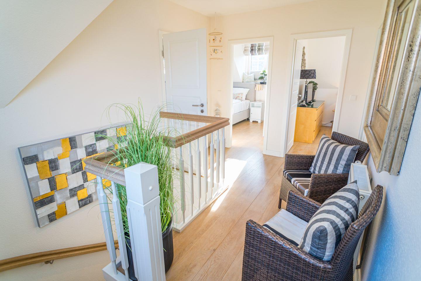 Im Erdgeschoss befindet sich der hell gestaltete, offene Wohnraum mit Sofa und TV. Ebenfalls zur Ausstattung gehört ein Mylin-Kachelofen. Angrenzend an den Wohnbereich befindet sich die offene, vollausgestattete Küche mit großem Esstisch. Vom Wohn- und Essbereich haben Sie Zutritt zur umlaufenden Terrasse in Südwestlicher Ausrichtung, mit Sylter Strandkorb und Gartenmöbeln (saisonal). Im Erdgeschoss befindet sich ebenfalls ein Badezimmer mit Dusche, Waschbecken und WC. Gelangt man über die Treppe in das Obergeschoss, findet man drei individuell dekorierte Schlafzimmer und ein modernes Wellnessbad mit großer runder Badewanne, Dusche und WC. Im Untergeschoss befindet sich die Waschmaschine und Trockner sowie die Sauna mit Dusche und WC.
