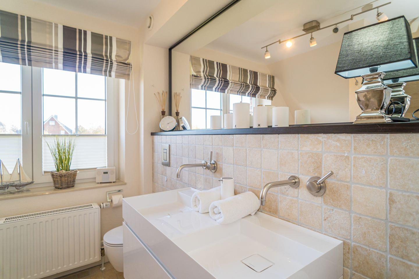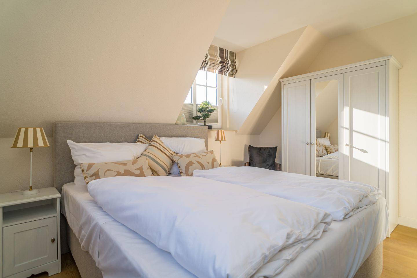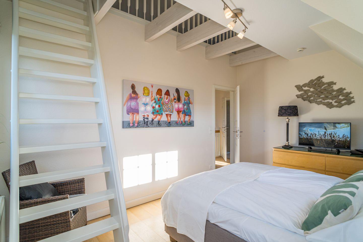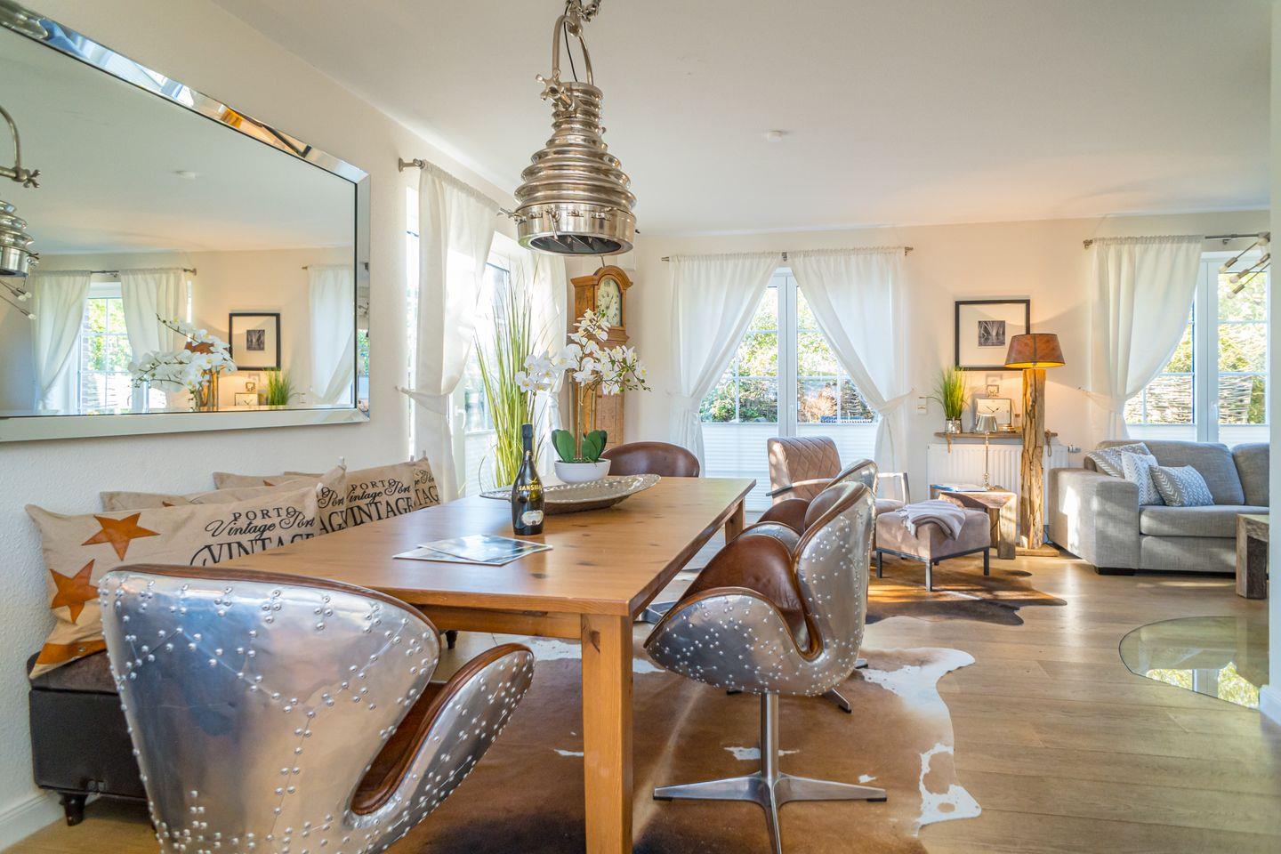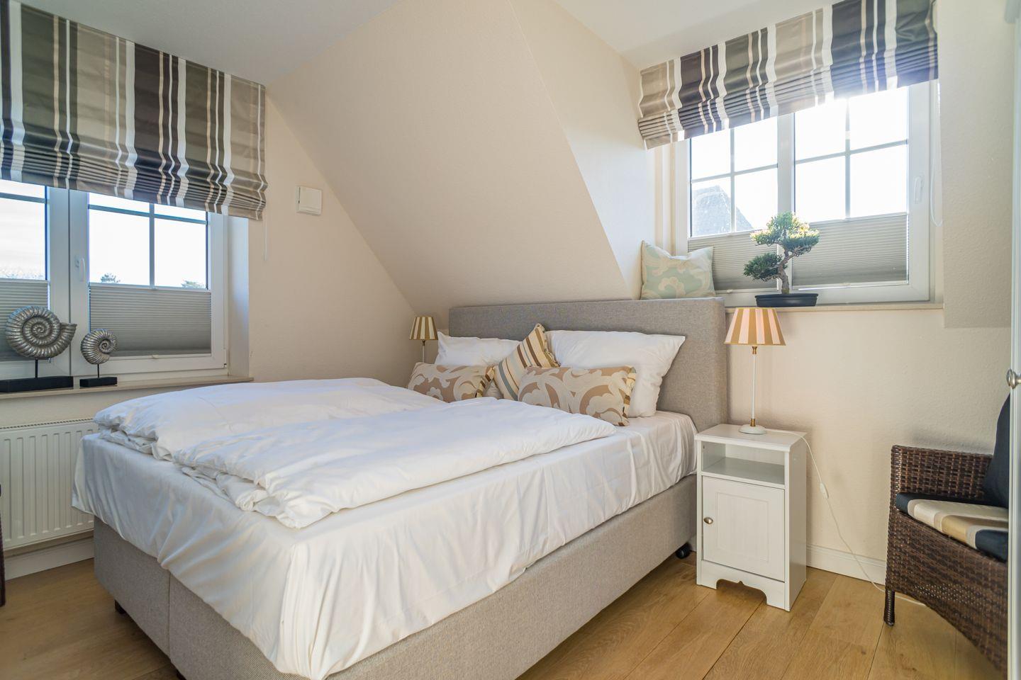 Im Erdgeschoss befindet sich der hell gestaltete, offene Wohnraum mit Sofa und TV. Ebenfalls zur Ausstattung gehört ein Mylin-Kachelofen. Angrenzend an den Wohnbereich befindet sich die offene, vollausgestattete Küche mit großem Esstisch. Vom Wohn- und Essbereich haben Sie Zutritt zur umlaufenden Terrasse in Südwestlicher Ausrichtung, mit Sylter Strandkorb und Gartenmöbeln (saisonal). Im Erdgeschoss befindet sich ebenfalls ein Badezimmer mit Dusche, Waschbecken und WC. Gelangt man über die Treppe in das Obergeschoss, findet man drei individuell dekorierte Schlafzimmer und ein modernes Wellnessbad mit großer runder Badewanne, Dusche und WC. Im Untergeschoss befindet sich die Waschmaschine und Trockner sowie die Sauna mit Dusche und WC.