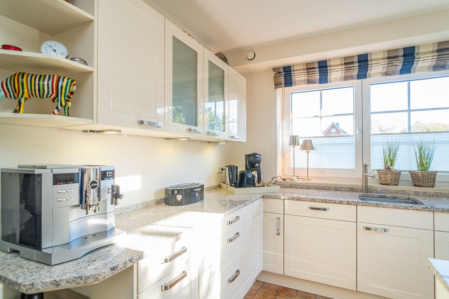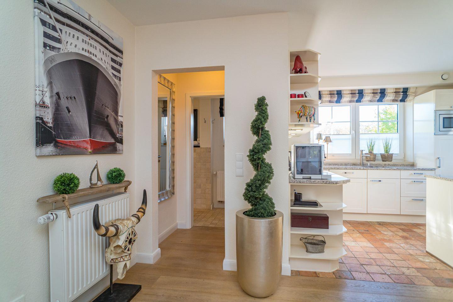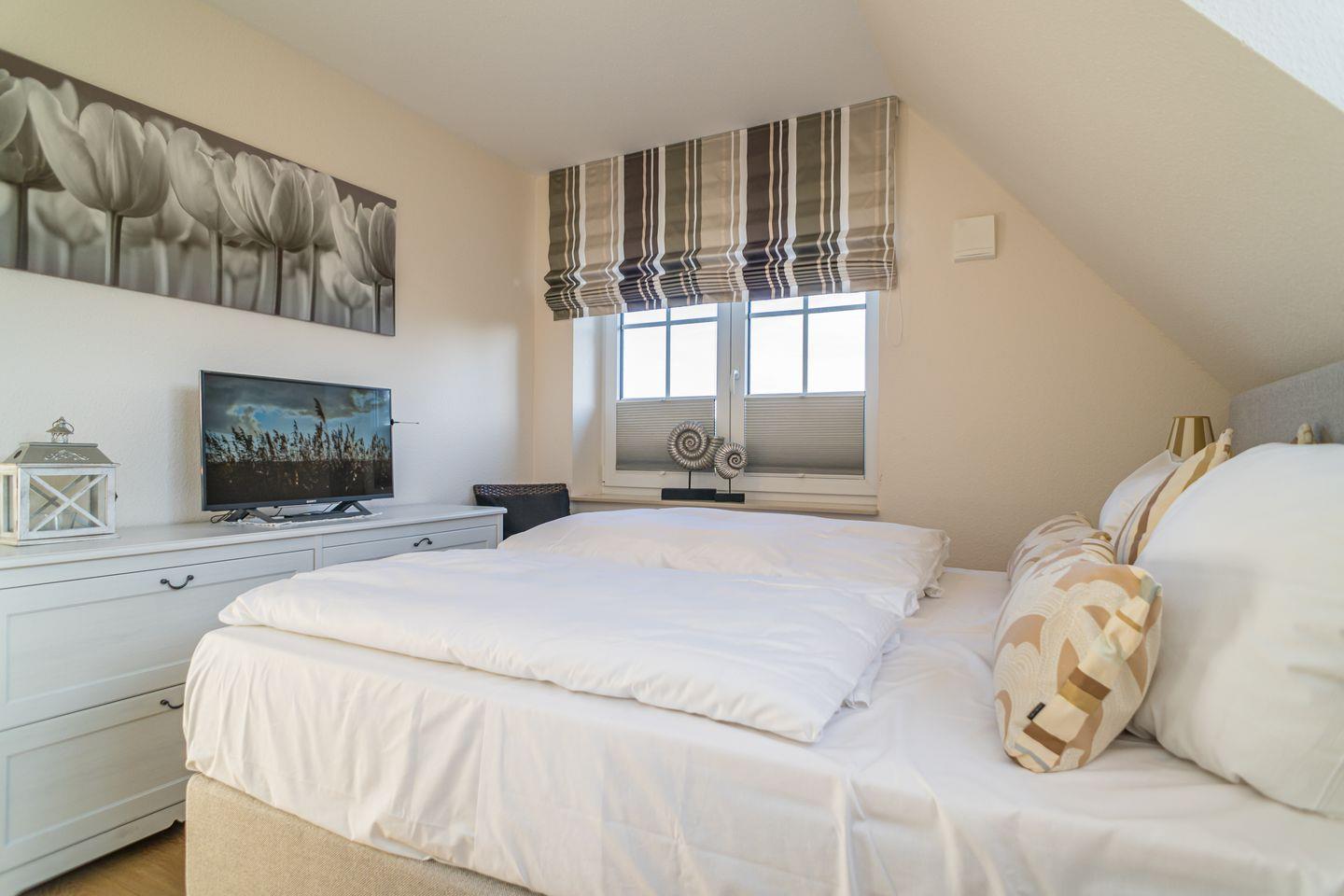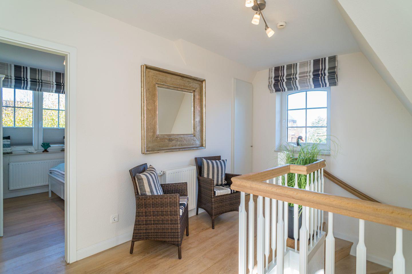 Im Erdgeschoss befindet sich der hell gestaltete, offene Wohnraum mit Sofa und TV. Ebenfalls zur Ausstattung gehört ein Mylin-Kachelofen. Angrenzend an den Wohnbereich befindet sich die offene, vollausgestattete Küche mit großem Esstisch. Vom Wohn- und Essbereich haben Sie Zutritt zur umlaufenden Terrasse in Südwestlicher Ausrichtung, mit Sylter Strandkorb und Gartenmöbeln (saisonal). Im Erdgeschoss befindet sich ebenfalls ein Badezimmer mit Dusche, Waschbecken und WC. Gelangt man über die Treppe in das Obergeschoss, findet man drei individuell dekorierte Schlafzimmer und ein modernes Wellnessbad mit großer runder Badewanne, Dusche und WC. Im Untergeschoss befindet sich die Waschmaschine und Trockner sowie die Sauna mit Dusche und WC.