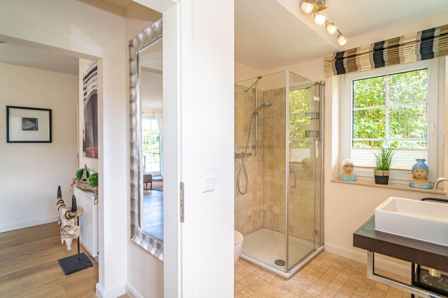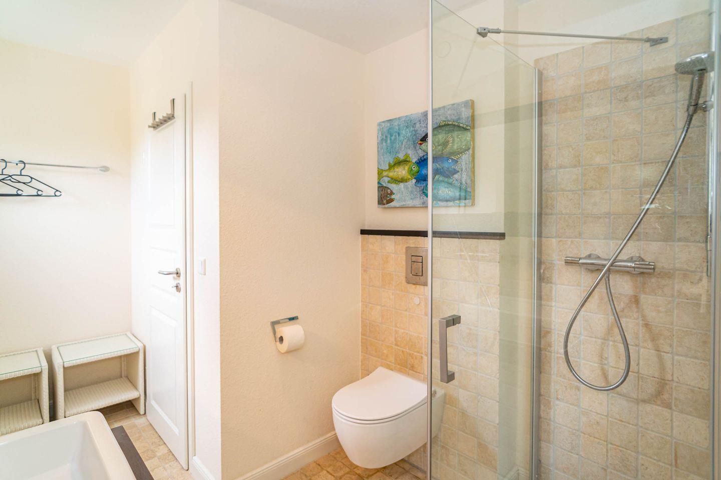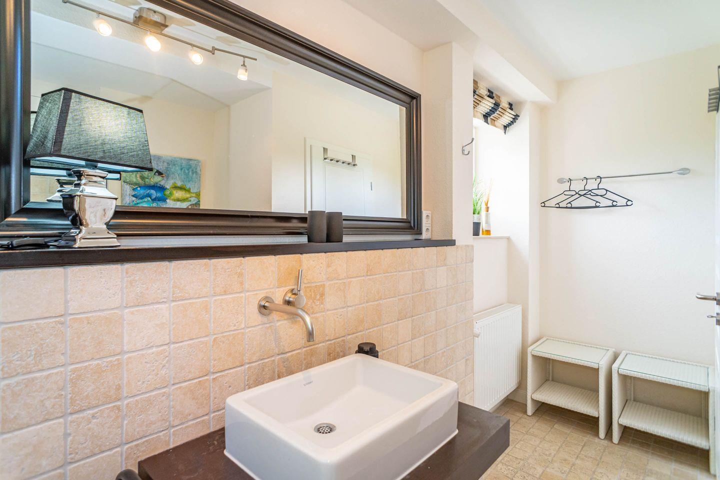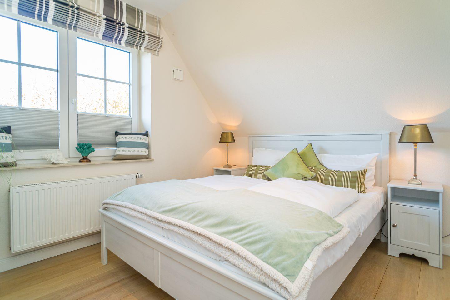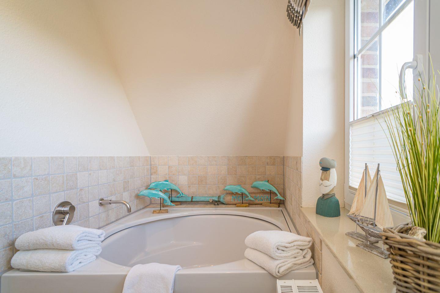 Im Erdgeschoss befindet sich der hell gestaltete, offene Wohnraum mit Sofa und TV. Ebenfalls zur Ausstattung gehört ein Mylin-Kachelofen. Angrenzend an den Wohnbereich befindet sich die offene, vollausgestattete Küche mit großem Esstisch. Vom Wohn- und Essbereich haben Sie Zutritt zur umlaufenden Terrasse in Südwestlicher Ausrichtung, mit Sylter Strandkorb und Gartenmöbeln (saisonal). Im Erdgeschoss befindet sich ebenfalls ein Badezimmer mit Dusche, Waschbecken und WC. Gelangt man über die Treppe in das Obergeschoss, findet man drei individuell dekorierte Schlafzimmer und ein modernes Wellnessbad mit großer runder Badewanne, Dusche und WC. Im Untergeschoss befindet sich die Waschmaschine und Trockner sowie die Sauna mit Dusche und WC.