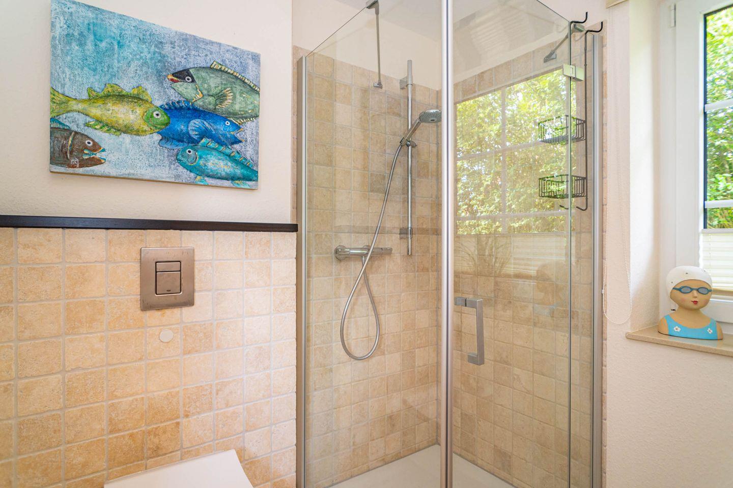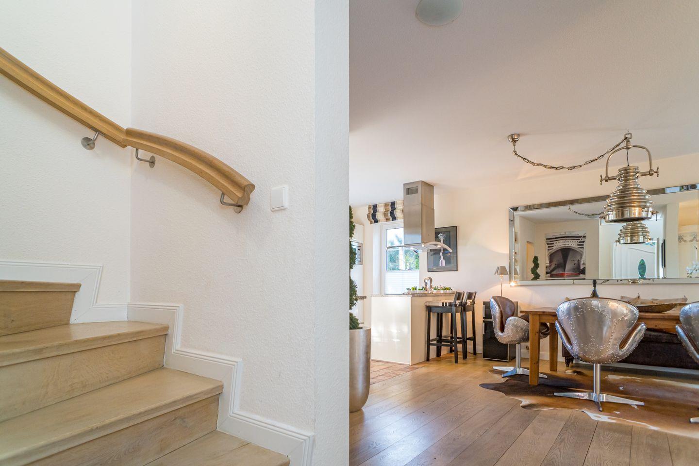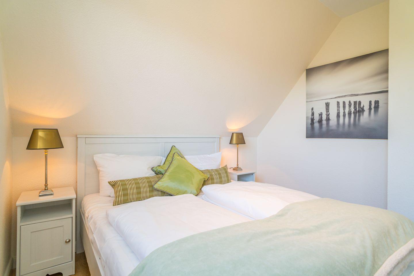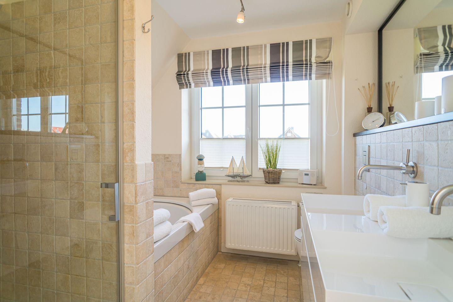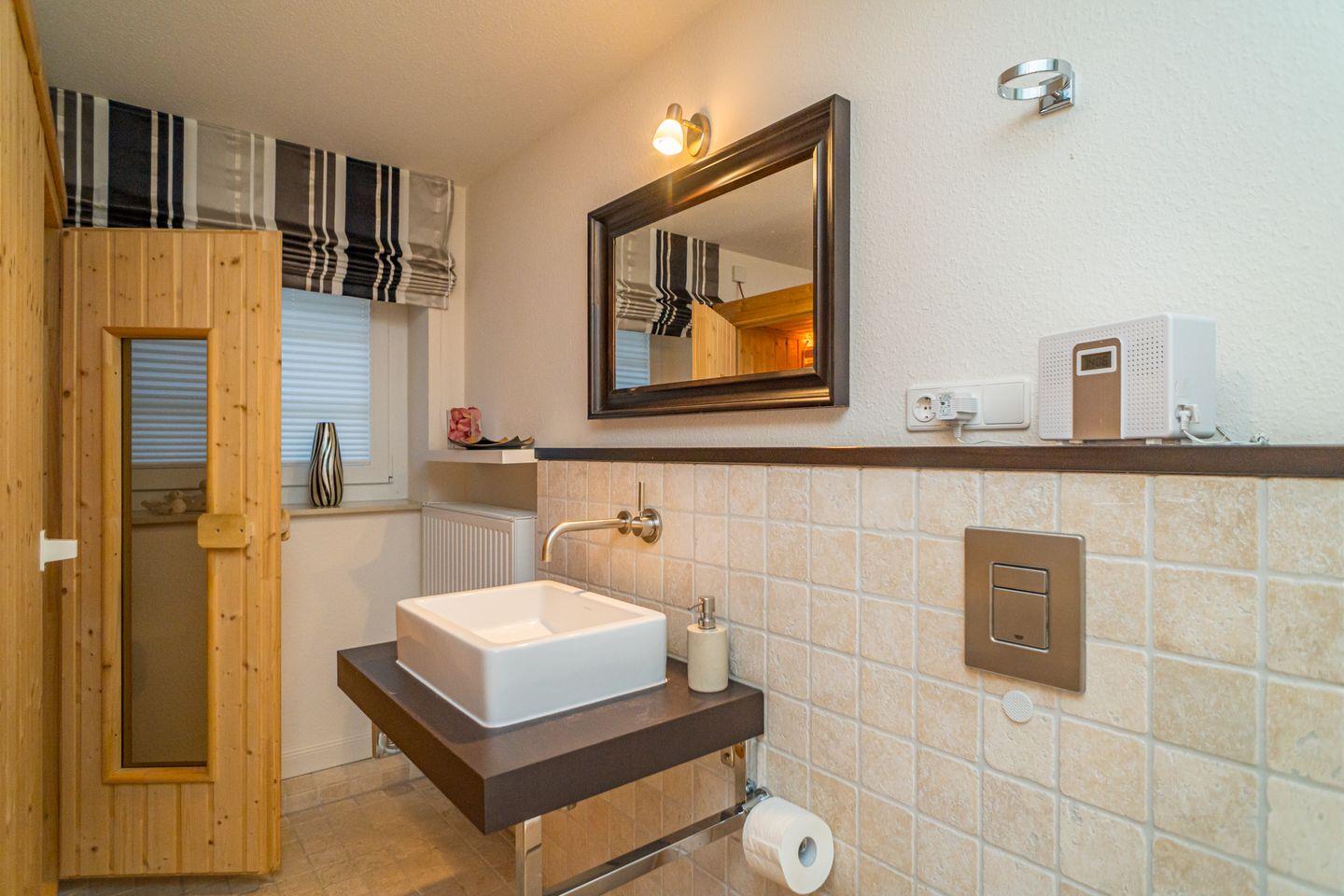 Im Erdgeschoss befindet sich der hell gestaltete, offene Wohnraum mit Sofa und TV. Ebenfalls zur Ausstattung gehört ein Mylin-Kachelofen. Angrenzend an den Wohnbereich befindet sich die offene, vollausgestattete Küche mit großem Esstisch. Vom Wohn- und Essbereich haben Sie Zutritt zur umlaufenden Terrasse in Südwestlicher Ausrichtung, mit Sylter Strandkorb und Gartenmöbeln (saisonal). Im Erdgeschoss befindet sich ebenfalls ein Badezimmer mit Dusche, Waschbecken und WC. Gelangt man über die Treppe in das Obergeschoss, findet man drei individuell dekorierte Schlafzimmer und ein modernes Wellnessbad mit großer runder Badewanne, Dusche und WC. Im Untergeschoss befindet sich die Waschmaschine und Trockner sowie die Sauna mit Dusche und WC.
