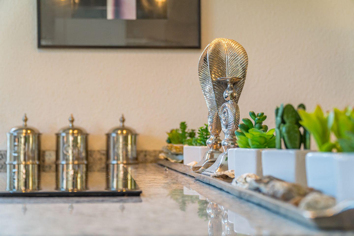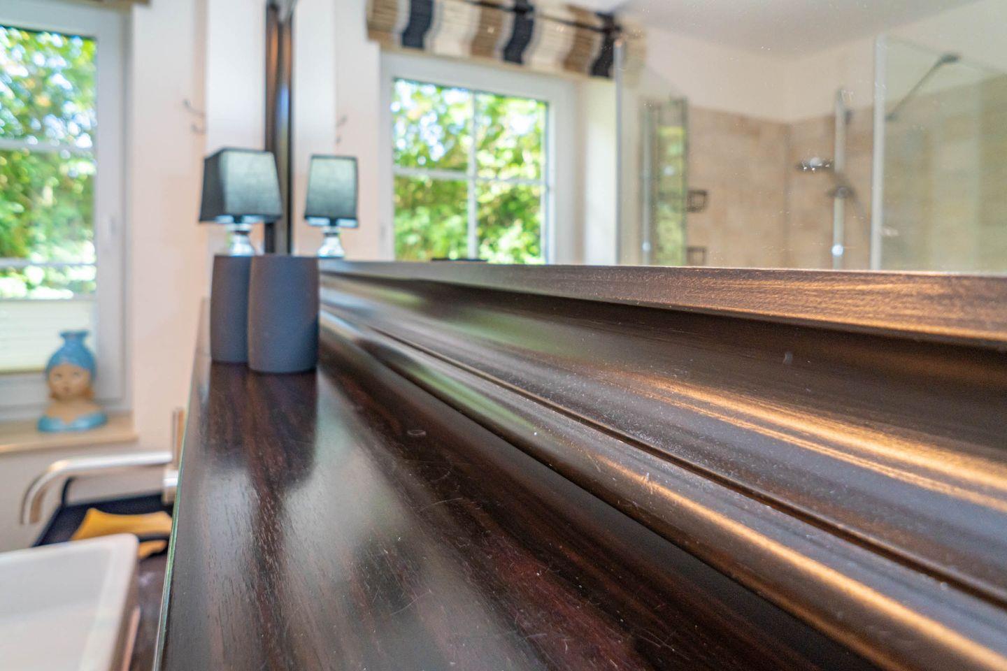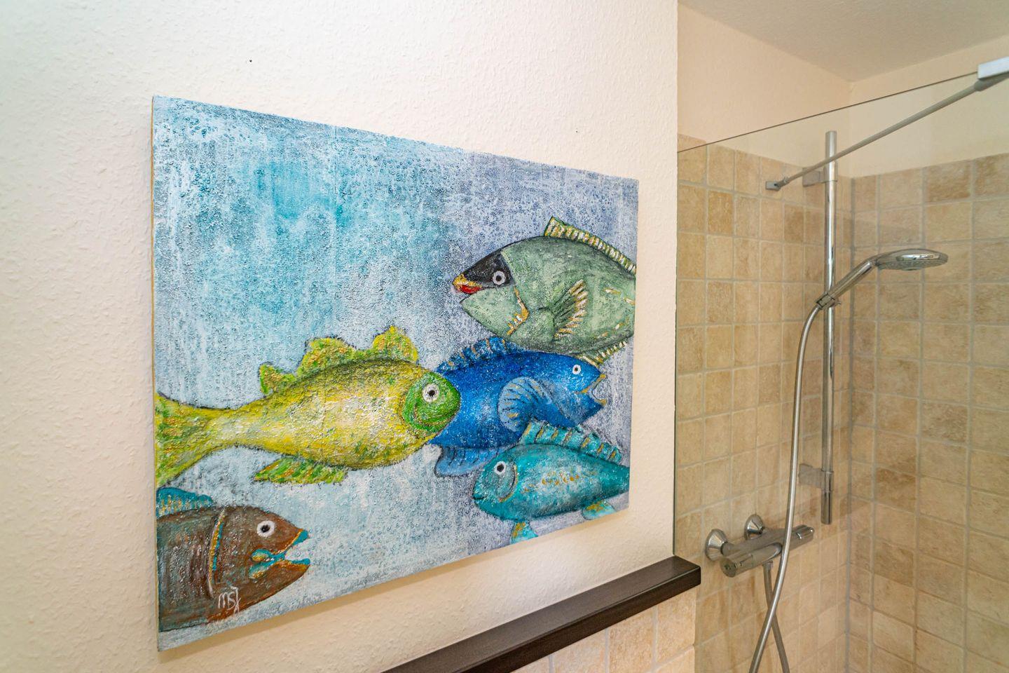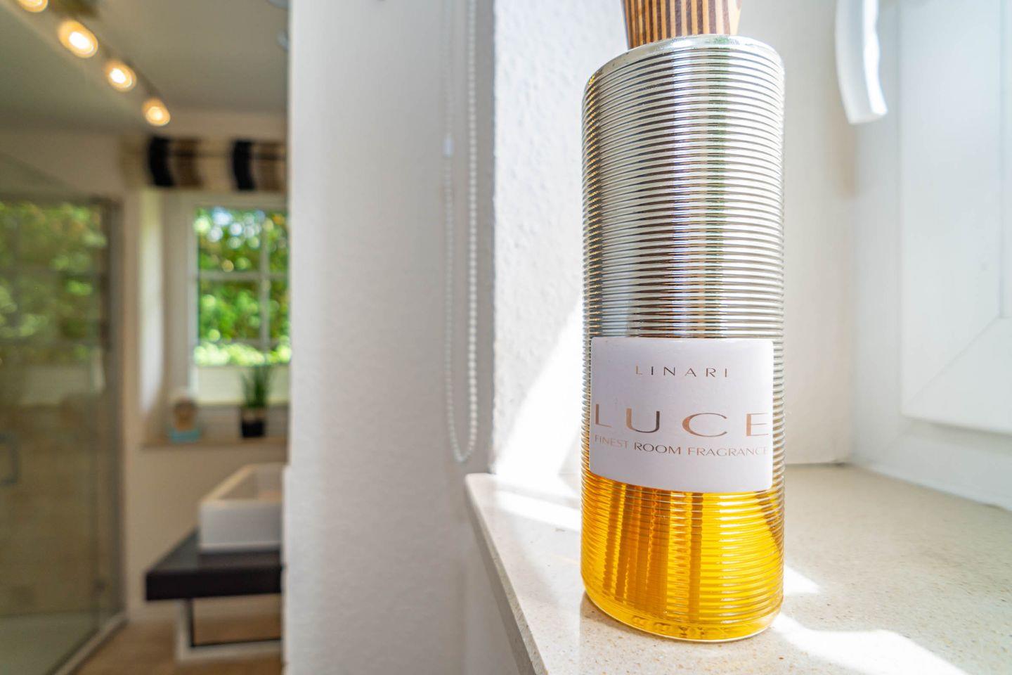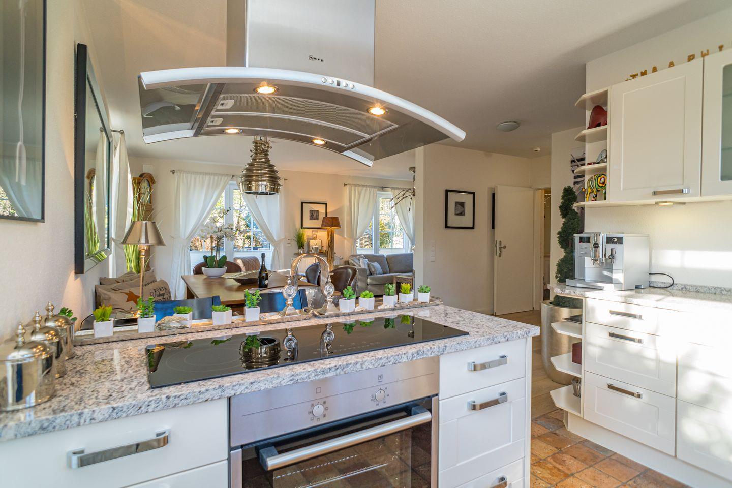 Im Erdgeschoss befindet sich der hell gestaltete, offene Wohnraum mit Sofa und TV. Ebenfalls zur Ausstattung gehört ein Mylin-Kachelofen. Angrenzend an den Wohnbereich befindet sich die offene, vollausgestattete Küche mit großem Esstisch. Vom Wohn- und Essbereich haben Sie Zutritt zur umlaufenden Terrasse in Südwestlicher Ausrichtung, mit Sylter Strandkorb und Gartenmöbeln (saisonal). Im Erdgeschoss befindet sich ebenfalls ein Badezimmer mit Dusche, Waschbecken und WC. Gelangt man über die Treppe in das Obergeschoss, findet man drei individuell dekorierte Schlafzimmer und ein modernes Wellnessbad mit großer runder Badewanne, Dusche und WC. Im Untergeschoss befindet sich die Waschmaschine und Trockner sowie die Sauna mit Dusche und WC.