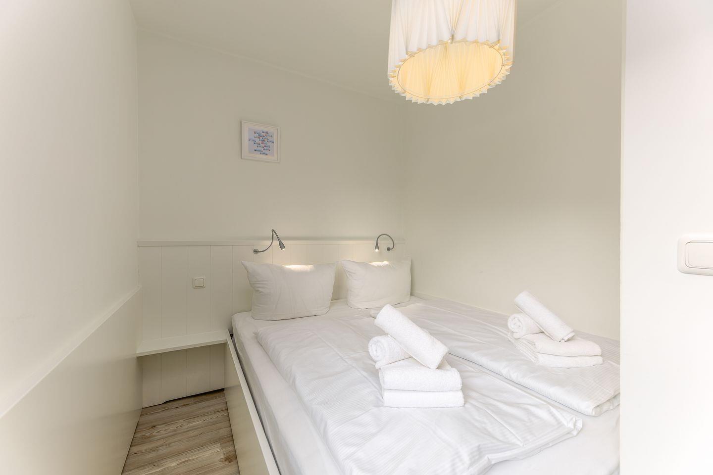 Wem der Sinn nach Grün steht, der macht es sich auf der kleinen Terrasse bequem. Im Inneren des Appartements bilden Weiß, Blau und Grau eine frische, klare Einheit. Ganz in Weiß gehalten präsentiert sich hingegen das Schlafzimmer, in dem das Doppelbett durch seinen Vordereinstieg wie eine kuschelige Koje anmutet. Maßgeschneiderte Einbauschränke sorgen nicht nur hier, sondern auch im Duschbad und Flur für genügend Stauraum. Kein Wunder, dass das Appartement nach einer Sylter Sagengestalt benannt wurde, denn der gute Geist Nis Puk, der für Erwachsene unsichtbar ist, schwebt in Form von viel Stilgefühl durch die ganze Wohnung.