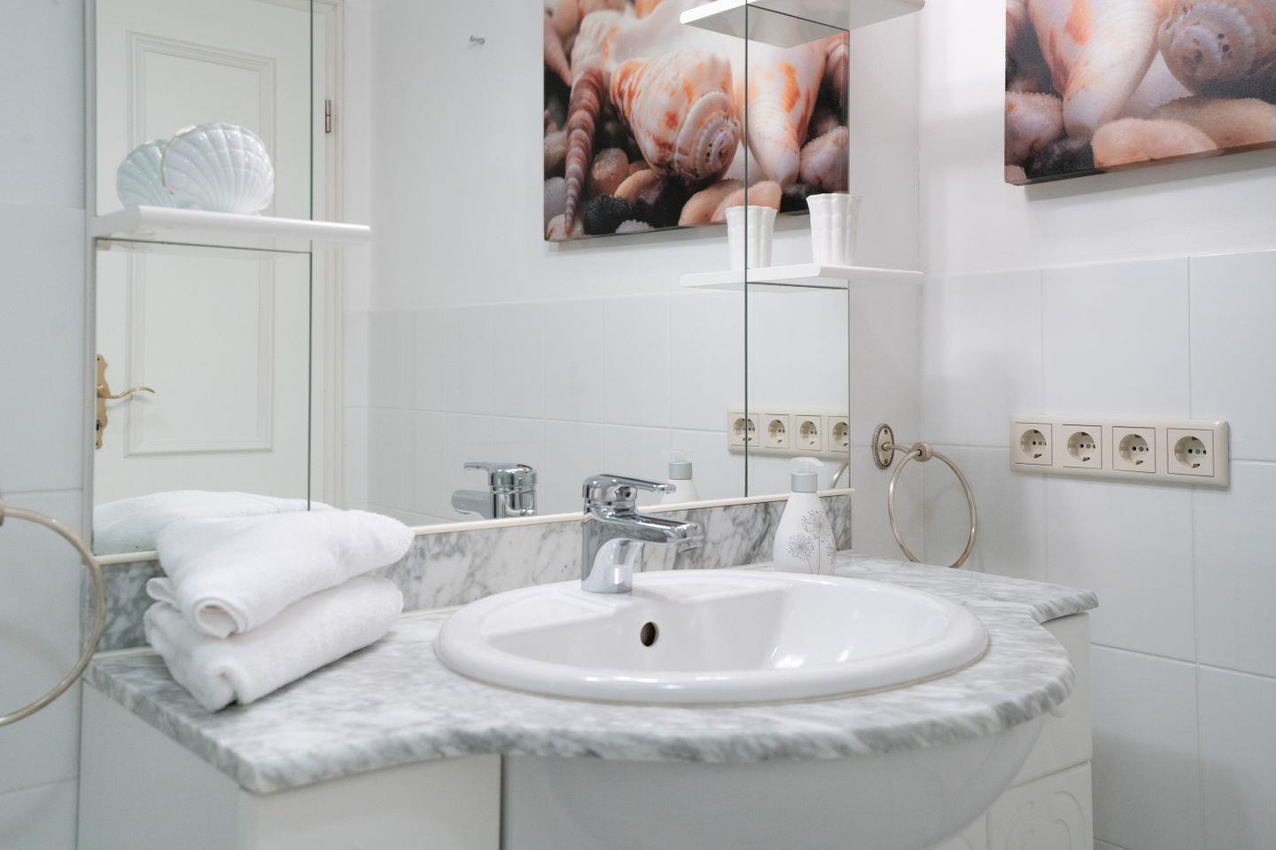 Sein lichtdurchfluteter Wohnraum mit Küchenzeile und kleinem Essbereich ist mit viel Holz, Naturtönen und charmanten Details äußerst gemütlich gestaltet - perfekt, um nach einem langen Strandtag die Füße hochzulegen. Eine schöne Alternative dafür bietet auch der Strandkorb auf der kleinen Terrasse (Südwest) direkt vor dem Appartement. Eine Treppe tiefer, im Souterrain, befinden sich das Schlafzimmer mit seinem komfortablen Doppelbett sowie das ganz in Weiß gehaltene Duschbad. Wer noch mehr "Wellness" möchte, kann kostenfrei die große Gemeinschaftssauna der Anlage nutzen.