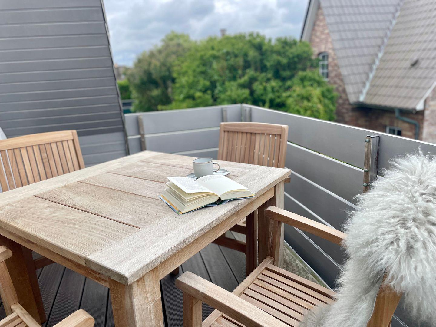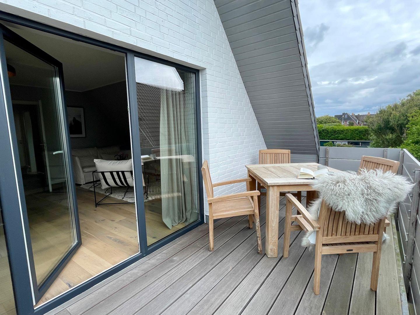 Das großzügige Wohnzimmer mit stilvollem Essbereich bildet das Herzstück der Wohnung. Von hier aus gelangen Sie auf einen weiteren Balkon mit Gartenmöbeln, der zu entspannten Stunden an der frischen Nordseeluft einlädt – ob beim Frühstück in der Sonne oder bei einem Glas Wein am Abend.