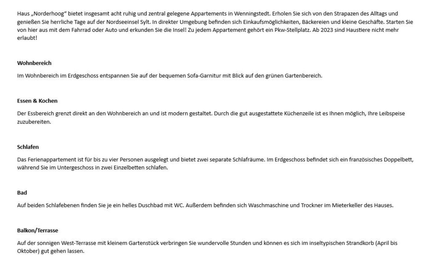 Haus „Norderhoog“ bietet insgesamt acht ruhig und zentral gelegene Appartements in Wenningstedt. Erholen Sie sich von den Strapazen des Alltags und genießen Sie herrliche Tage auf der Nordseeinsel Sylt. In direkter Umgebung befinden sich Einkaufsmöglichkeiten, Bäckereien und kleine Geschäfte. Starten Sie von hier aus mit dem Fahrrad oder Auto und erkunden Sie die Insel! Zu jedem Appartement gehört ein Pkw-Stellplatz. Ab 2023 sind Haustiere nicht mehr erlaubt!