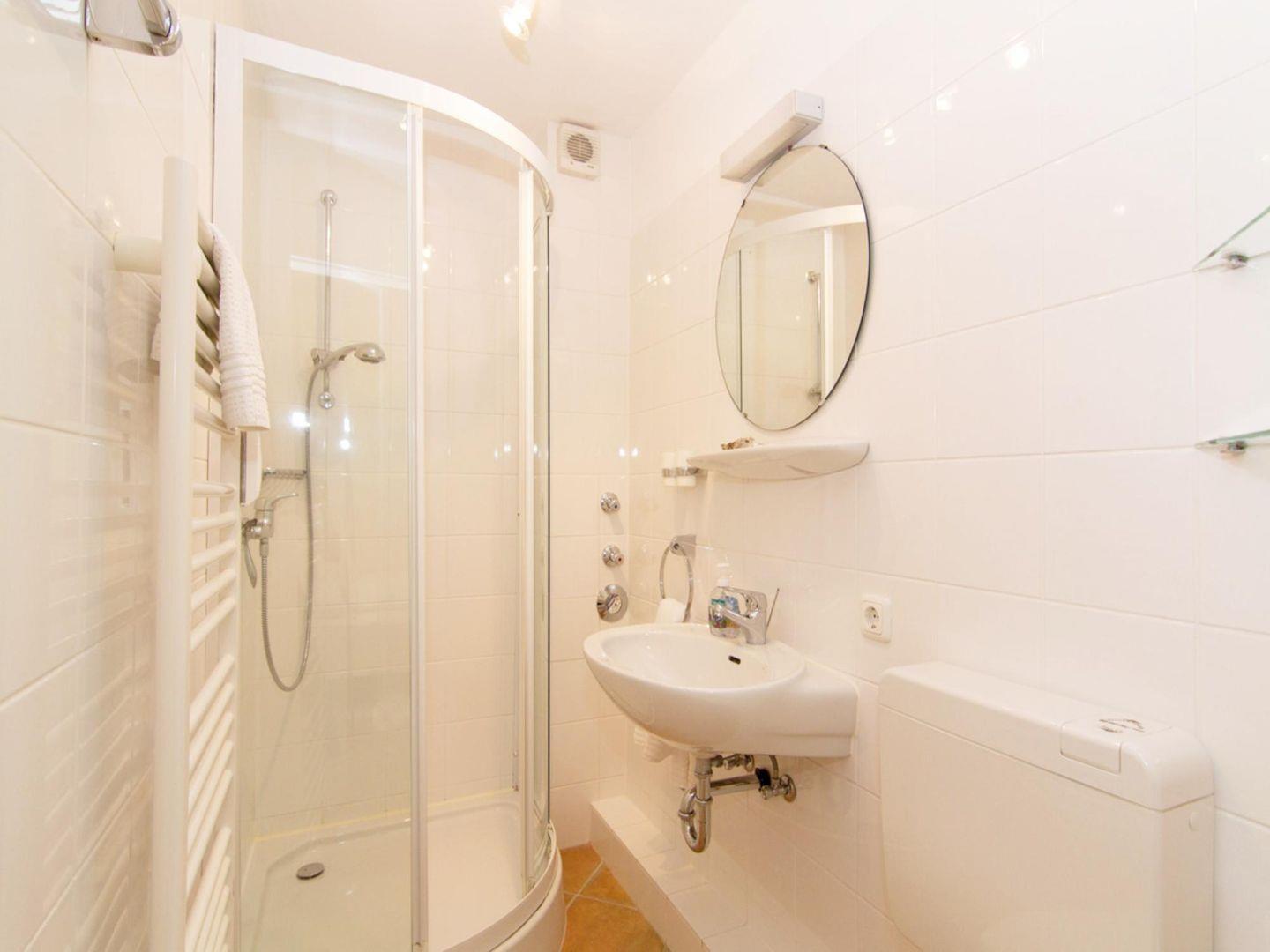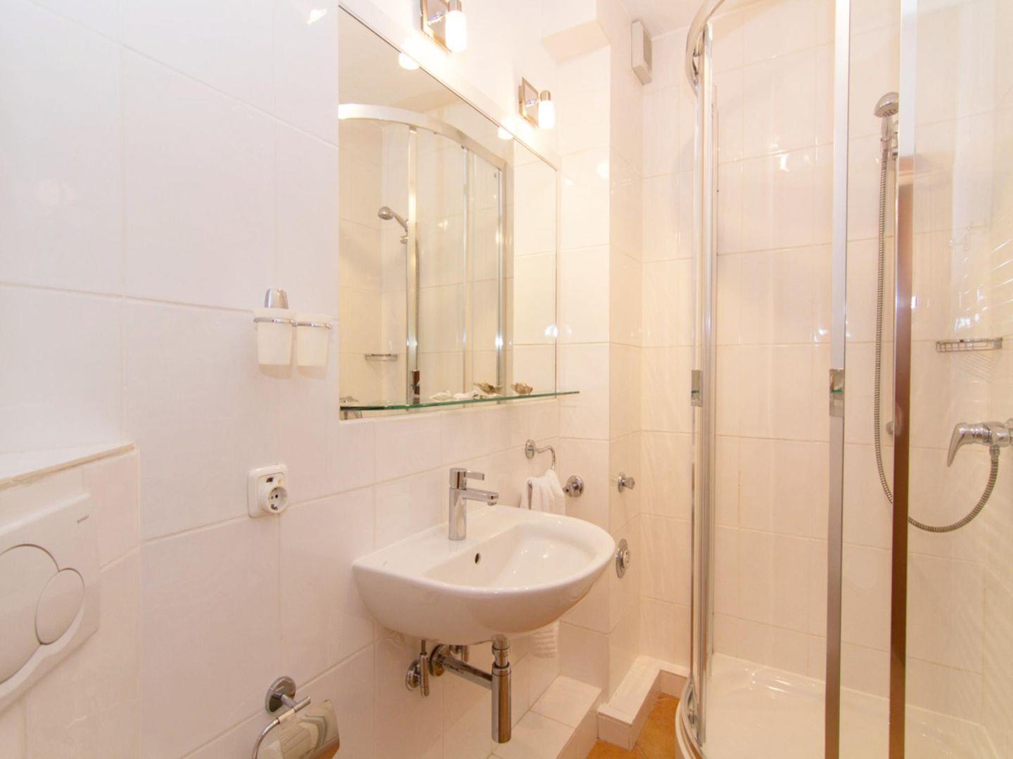 Auf beiden Schlafebenen finden Sie je ein helles Duschbad mit WC. Außerdem befinden sich Waschmaschine und Trockner im Mieterkeller des Hauses.