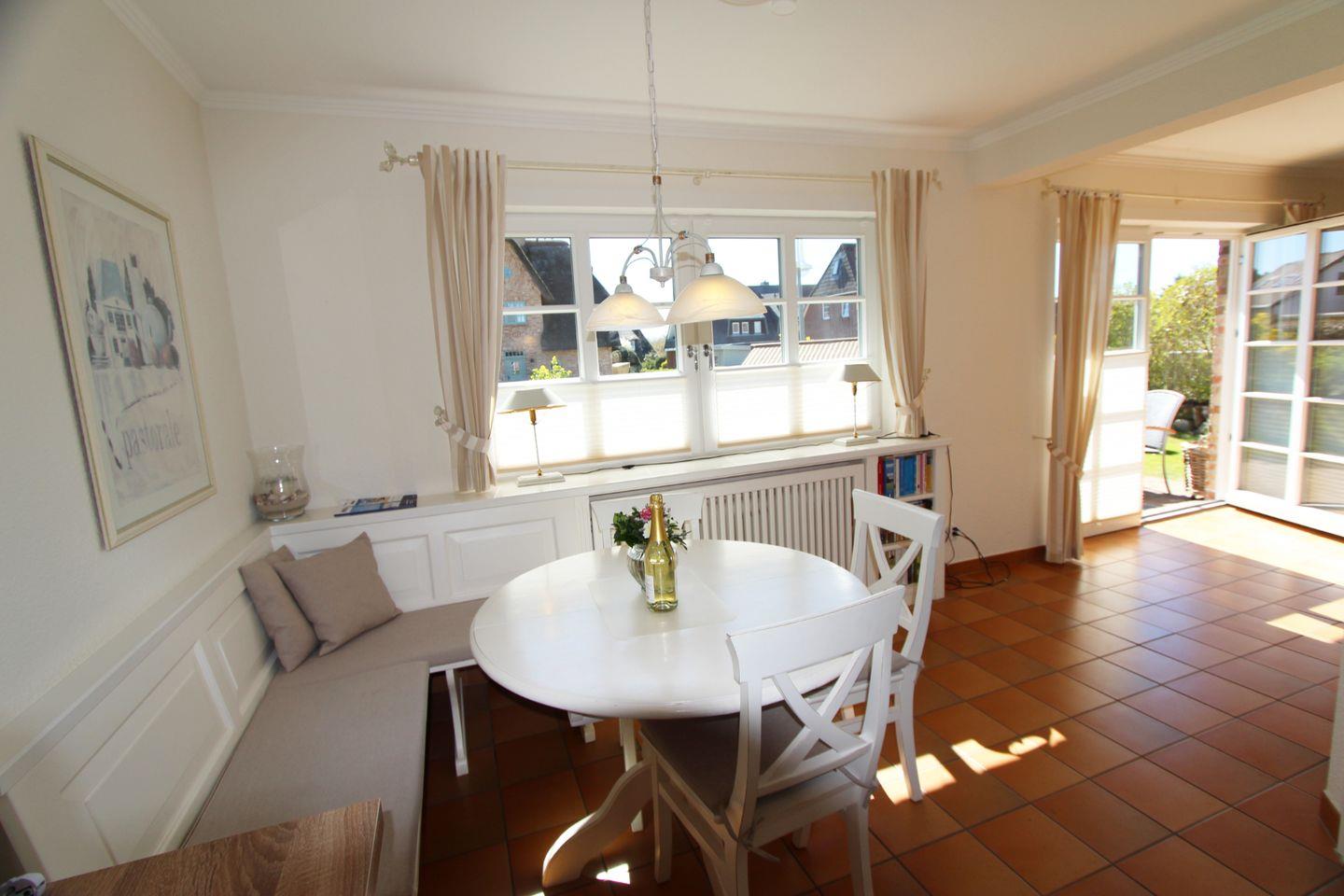 In einem klassisch-nordischen Stil gehalten befindet sich die Küche an den Wohnraum angrenzend und ist umfassend ausgestattet. Der Esstisch mit einer urgemütlichen Sitzbank bietet Platz für bis zu sechs Personen. Hier kann nach Herzenslust gespeist werden.