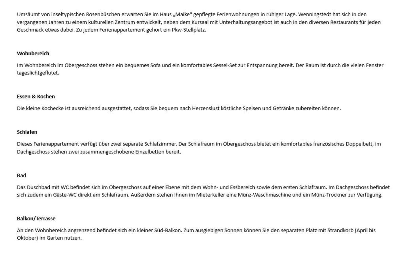 Umsäumt von inseltypischen Rosenbüschen erwarten Sie im Haus „Maike“ gepflegte Ferienwohnungen in ruhiger Lage. Wenningstedt hat sich in den vergangenen Jahren zu einem kulturellen Zentrum entwickelt, neben dem Kursaal mit Unterhaltungsangebot ist auch in den diversen Restaurants für jeden Geschmack etwas dabei. Zu jedem Ferienappartement gehört ein Pkw-Stellplatz.