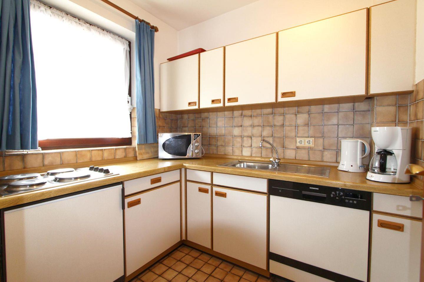 Die separate Küche bietet genügend Platz und Arbeitsflächen, um gemeinsam zu kochen. Am Essensplatz im Wohnbereich kann mit zu vier Personen gespeist werden.