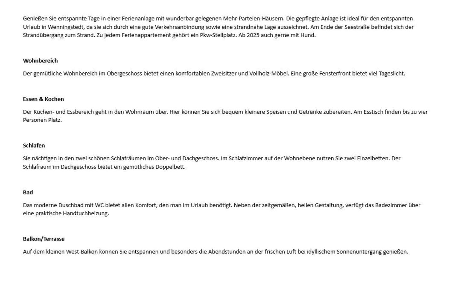 Genießen Sie entspannte Tage in einer Ferienanlage mit wunderbar gelegenen Mehr-Parteien-Häusern. Die gepflegte Anlage ist ideal für den entspannten Urlaub in Wenningstedt, da sie sich durch eine gute Verkehrsanbindung sowie eine strandnahe Lage auszeichnet. Am Ende der Seestraße befindet sich der Strandübergang zum Strand. Zu jedem Ferienappartement gehört ein Pkw-Stellplatz. Ab 2025 auch gerne mit Hund.