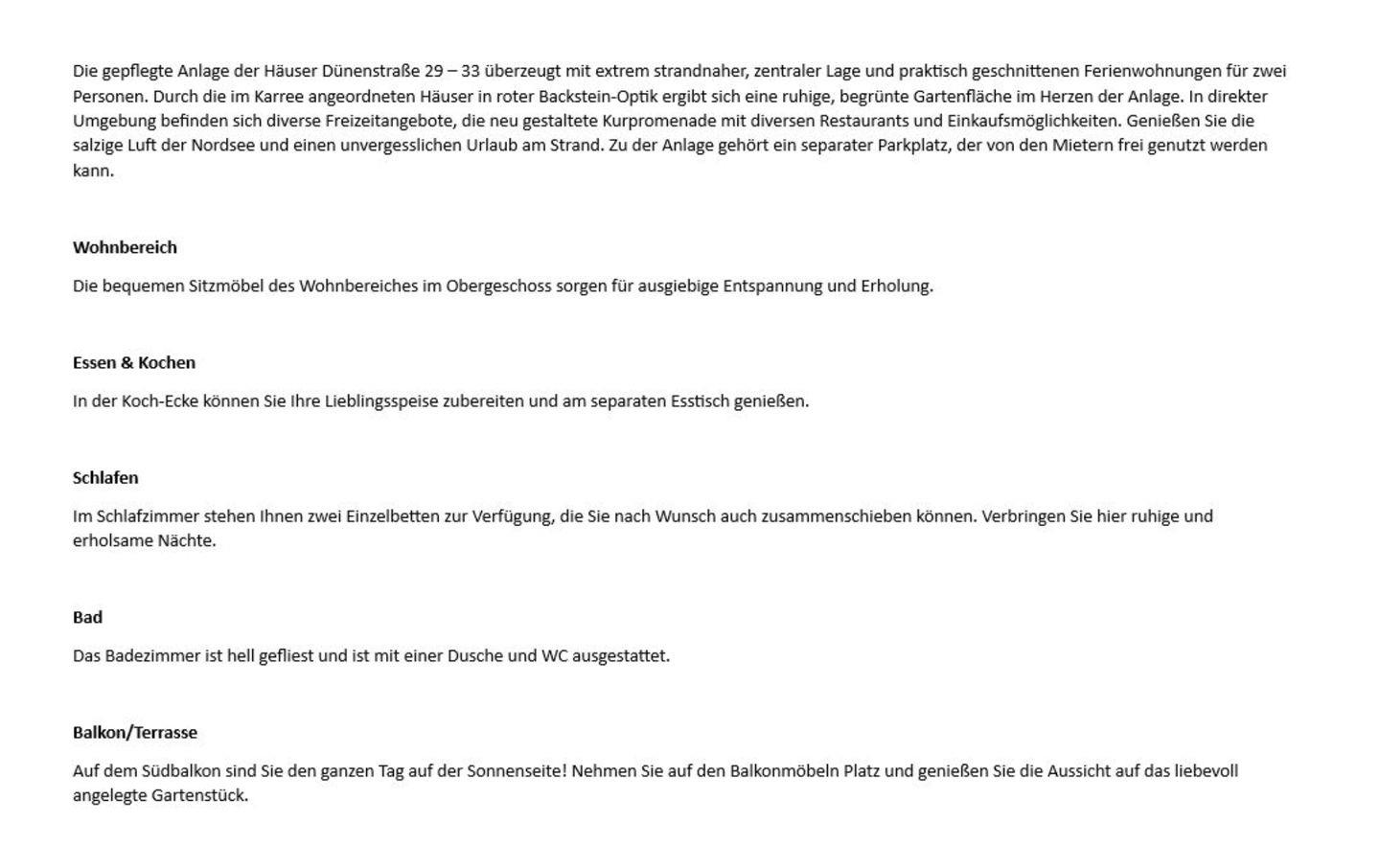 Die gepflegte Anlage der Häuser Dünenstraße 29 – 33 überzeugt mit extrem strandnaher, zentraler Lage und praktisch geschnittenen Ferienwohnungen für zwei Personen. Durch die im Karree angeordneten Häuser in roter Backstein-Optik ergibt sich eine ruhige, begrünte Gartenfläche im Herzen der Anlage. In direkter Umgebung befinden sich diverse Freizeitangebote, die neu gestaltete Kurpromenade mit diversen Restaurants und Einkaufsmöglichkeiten. Genießen Sie die salzige Luft der Nordsee und einen unvergesslichen Urlaub am Strand. Zu der Anlage gehört ein separater Parkplatz, der von den Mietern frei genutzt werden kann.