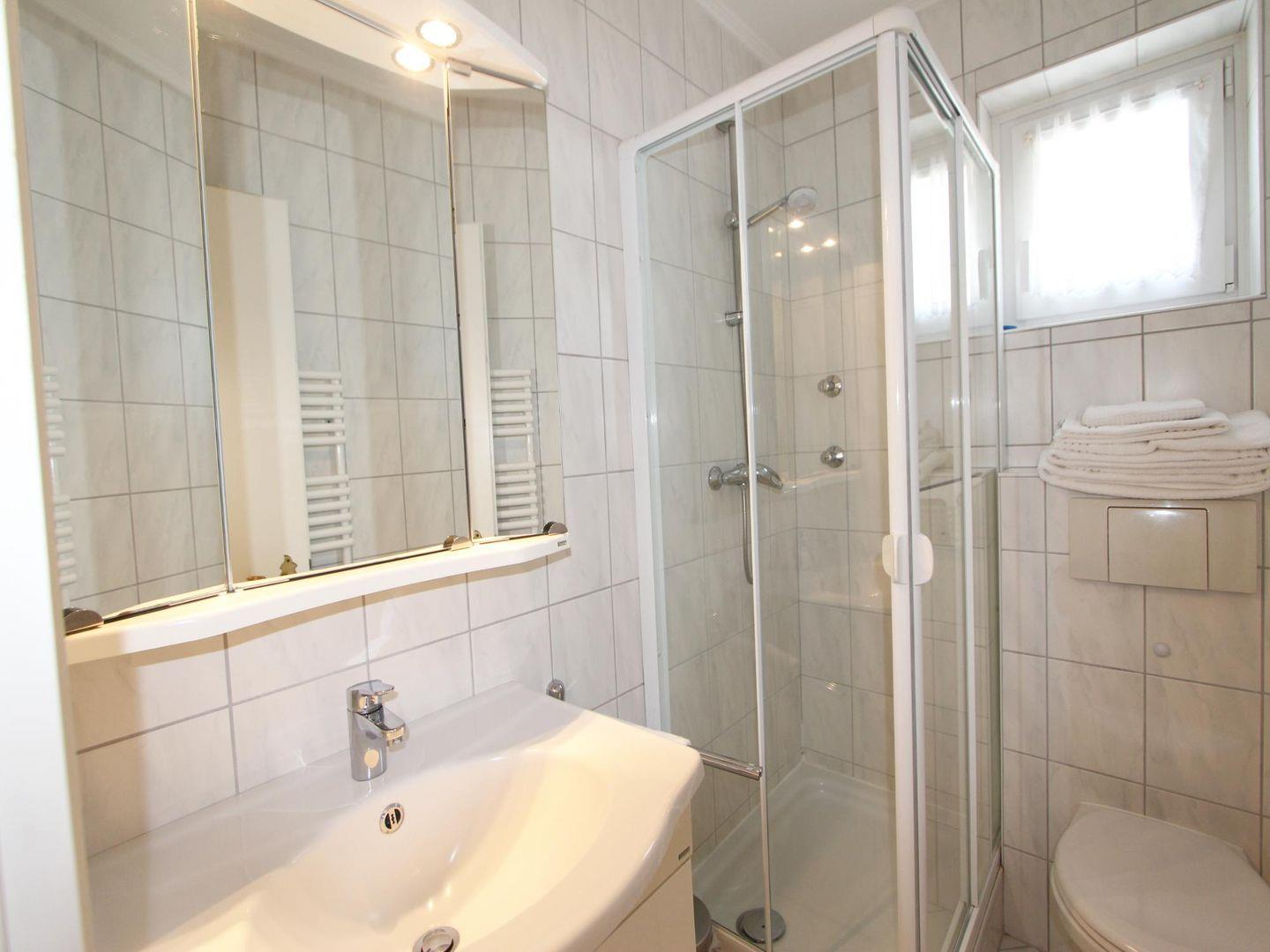 Das Badezimmer ist hell gefliest und ist mit einer Dusche und WC ausgestattet.