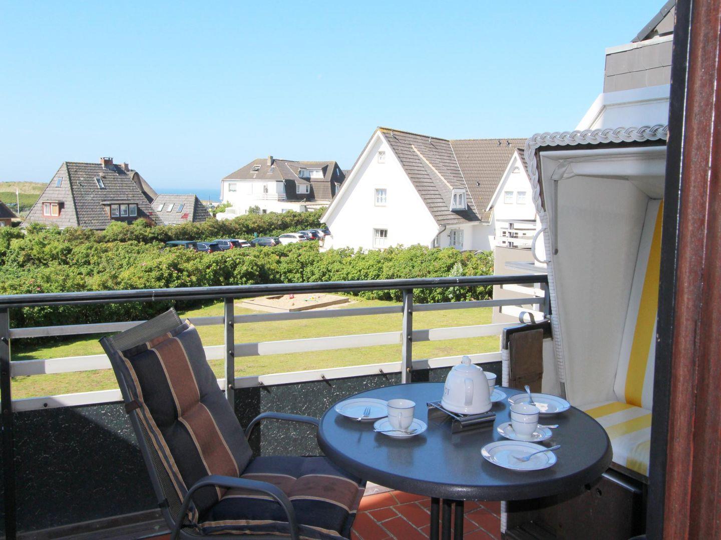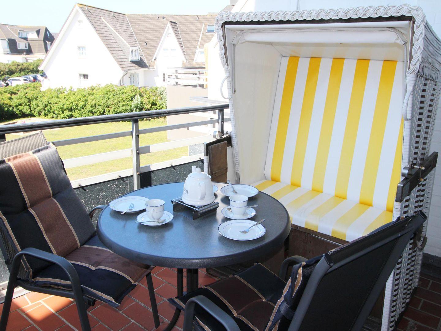 Auf dem sonnigen Süd-Balkon mit Strandkorb (April bis Oktober) verbringen Sie erholsame Stunden und genießen dabei Blick auf die endlosen Weiten des Meeres.