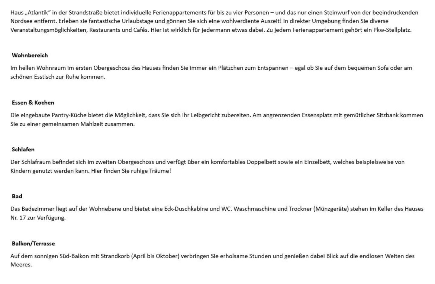 Haus „Atlantik“ in der Strandstraße bietet individuelle Ferienappartements für bis zu vier Personen – und das nur einen Steinwurf von der beeindruckenden Nordsee entfernt. Erleben sie fantastische Urlaubstage und gönnen Sie sich eine wohlverdiente Auszeit! In direkter Umgebung finden Sie diverse Veranstaltungsmöglichkeiten, Restaurants und Cafés. Hier ist wirklich für jedermann etwas dabei. Zu jedem Ferienappartement gehört ein Pkw-Stellplatz.