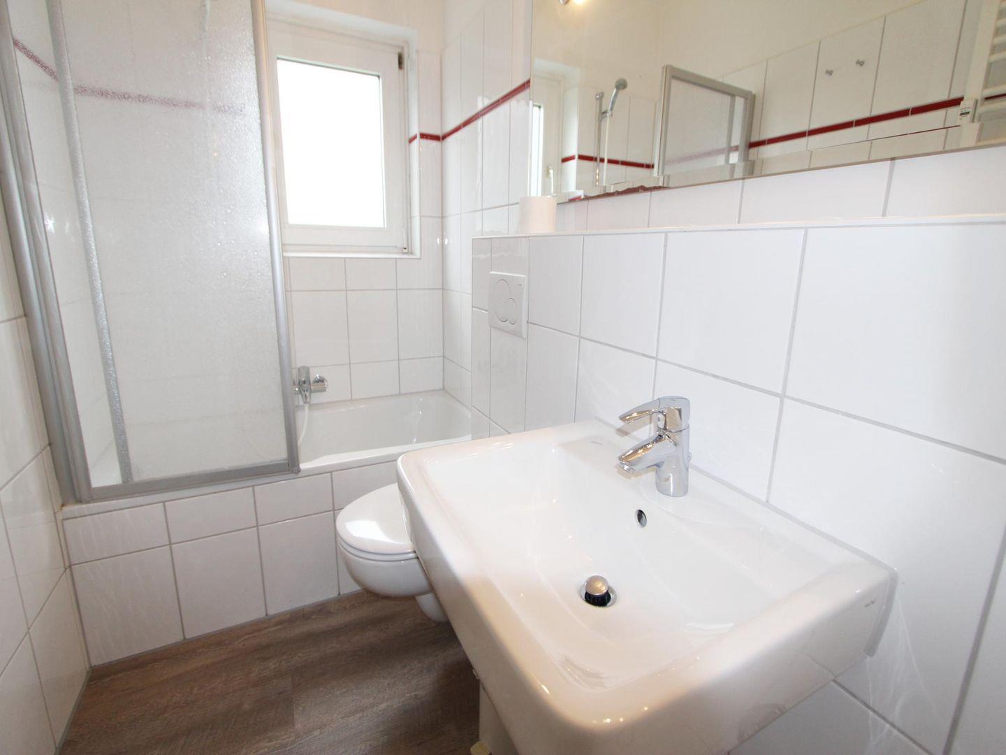 Das Wannenbad mit WC und tollem Vinyl-Fußboden ist hell und freundlich. Starten Sie erfrischt in den Urlaubstag! Eine Waschmaschine und Trockner stehen als Münzgeräte im Mieterkeller zur Verfügung.