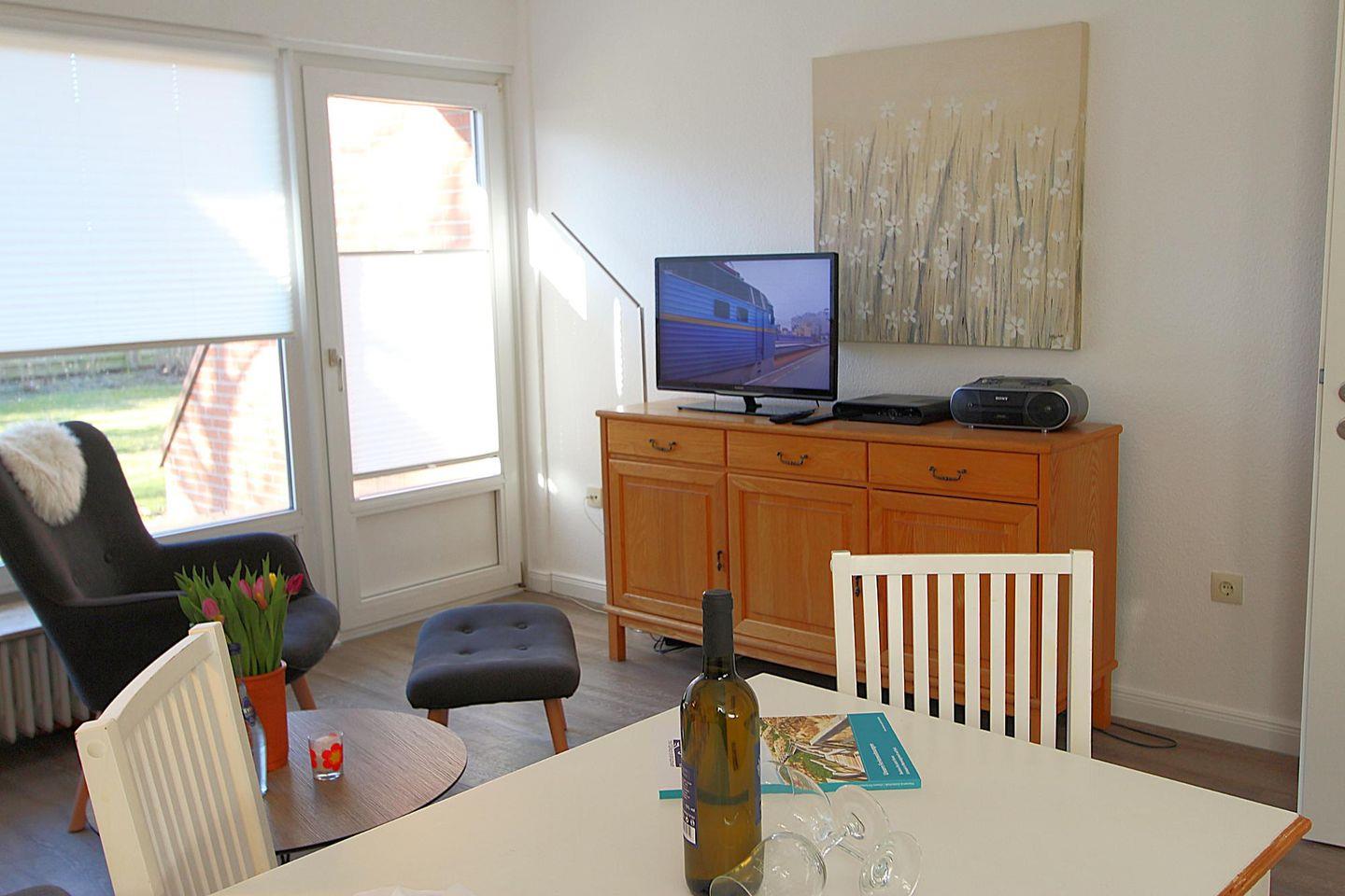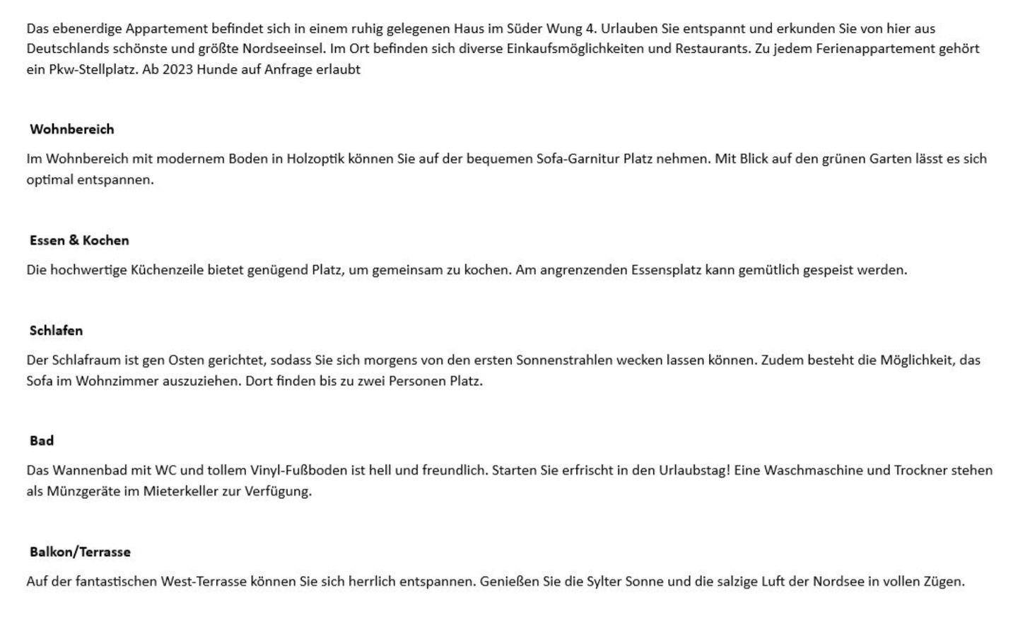 Ruhig gelegene Endwohnung im Erdgeschoss mit charmanter Einrichtung. Das Ferienappartement bietet Platz für bis zu vier Personen und eine großzügige Terrasse mit West-Ausrichtung. Ideal für einen Urlaub mit Familie oder Freunden, ab 2023 gerne auch mit Hund.