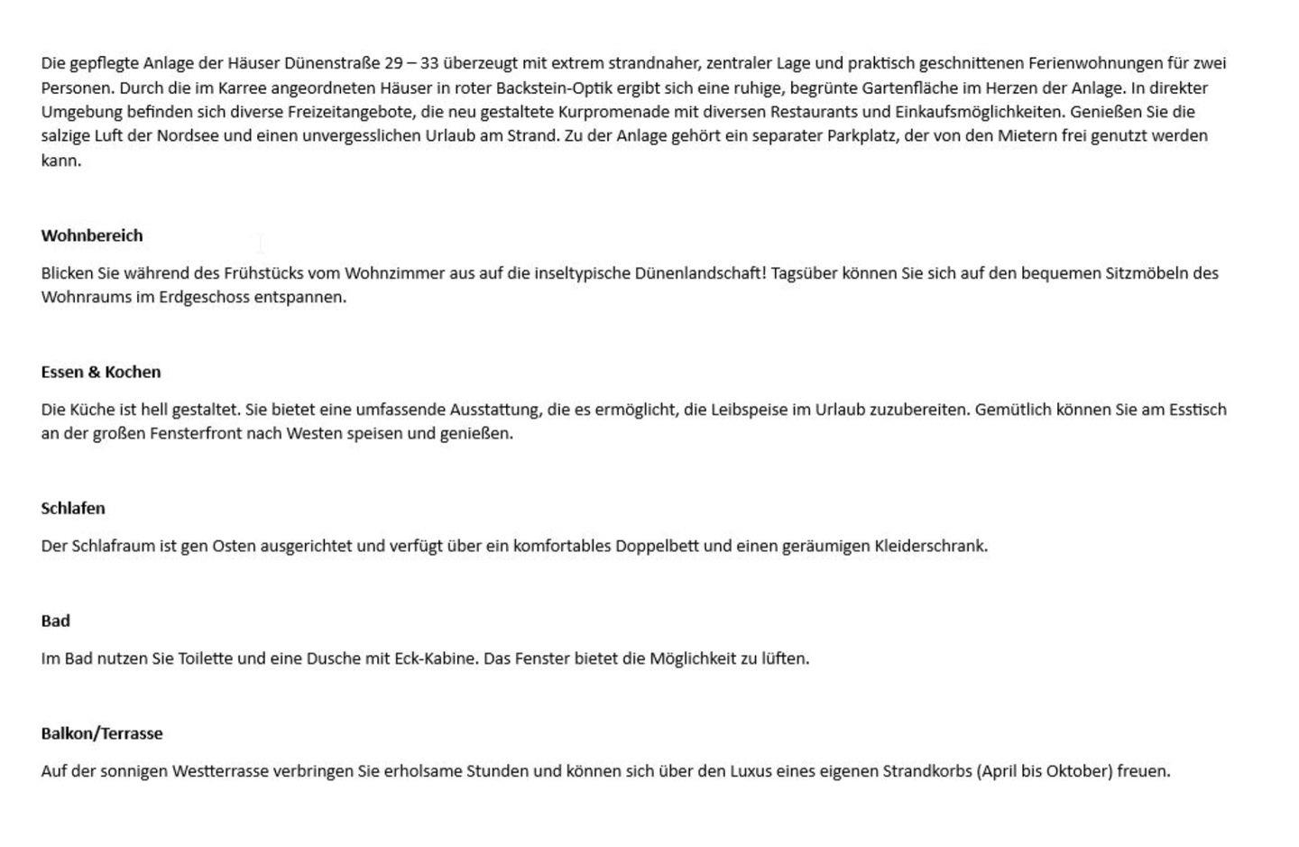 Die gepflegte Anlage der Häuser Dünenstraße 29 – 33 überzeugt mit extrem strandnaher, zentraler Lage und praktisch geschnittenen Ferienwohnungen für zwei Personen. Durch die im Karree angeordneten Häuser in roter Backstein-Optik ergibt sich eine ruhige, begrünte Gartenfläche im Herzen der Anlage. In direkter Umgebung befinden sich diverse Freizeitangebote, die neu gestaltete Kurpromenade mit diversen Restaurants und Einkaufsmöglichkeiten. Genießen Sie die salzige Luft der Nordsee und einen unvergesslichen Urlaub am Strand. Zu der Anlage gehört ein separater Parkplatz, der von den Mietern frei genutzt werden kann.