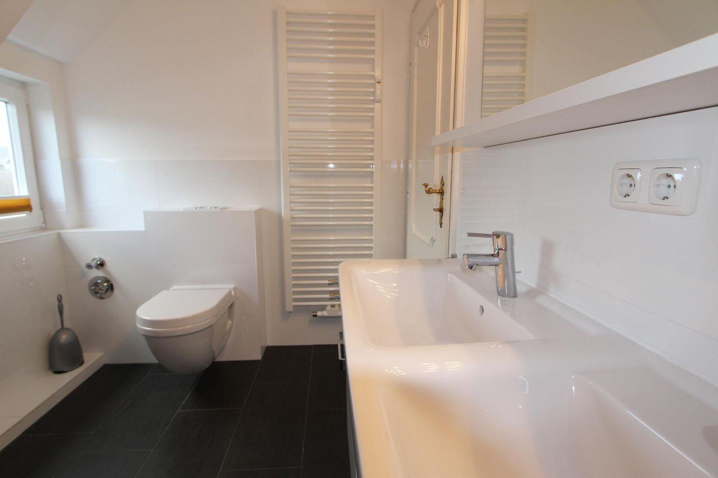 Im Badezimmer steht Ihnen eine großzügige Badewanne zur Verfügung, die auch als Dusche genutzt werden kann. Ferner bietet der Raum einen Doppelwaschtisch und WC.