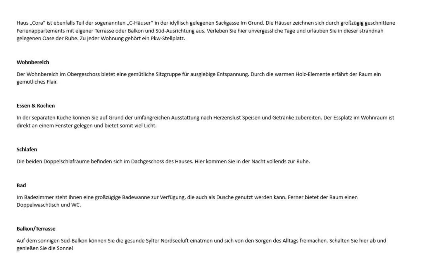 Haus „Cora“ ist ebenfalls Teil der sogenannten „C-Häuser“ in der idyllisch gelegenen Sackgasse Im Grund. Die Häuser zeichnen sich durch großzügig geschnittene Ferienappartements mit eigener Terrasse oder Balkon und Süd-Ausrichtung aus. Verleben Sie hier unvergessliche Tage und urlauben Sie in dieser strandnah gelegenen Oase der Ruhe. Zu jeder Wohnung gehört ein Pkw-Stellplatz.