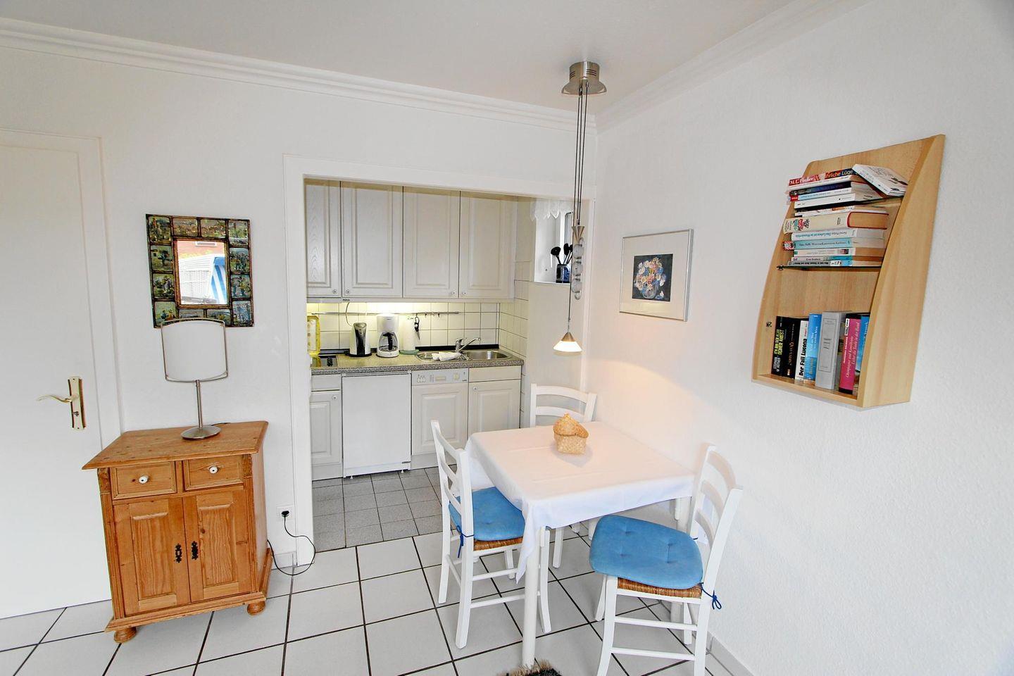 In der Kochnische, die an den Wohnbereich angrenzt, können Sie sich kleinere Speisen und Getränke zubereiten. Der Esstisch bietet Platz für zwei Personen.