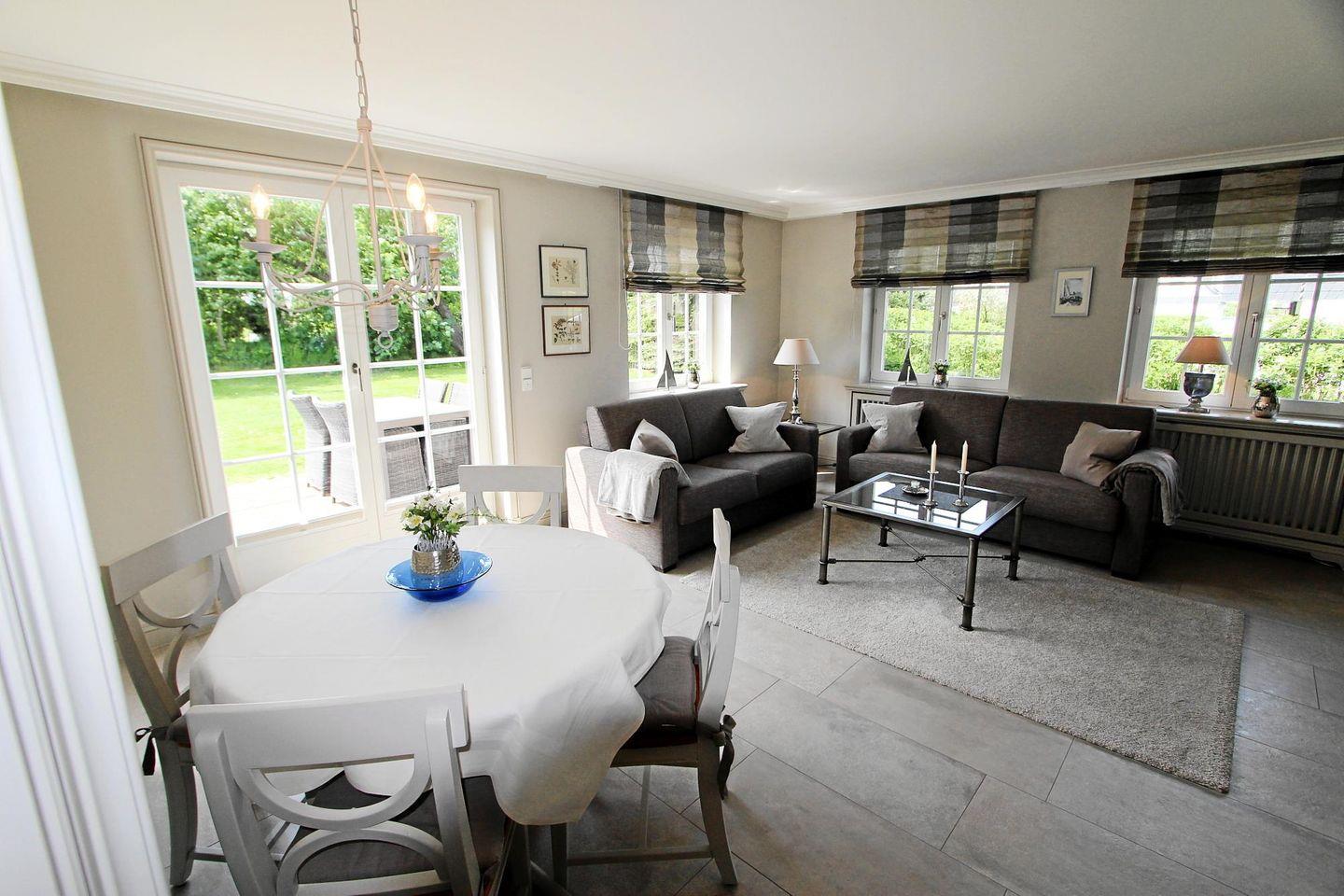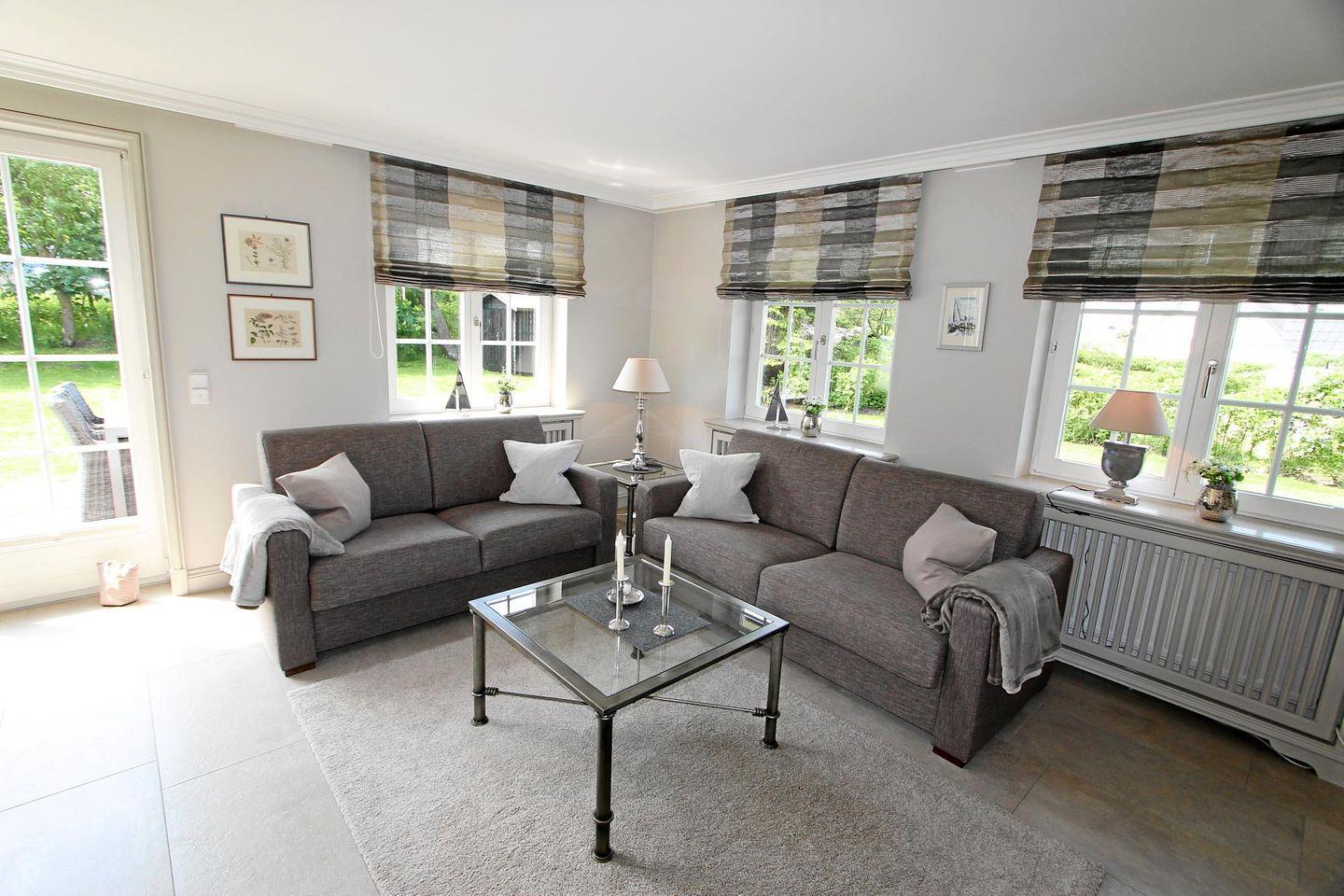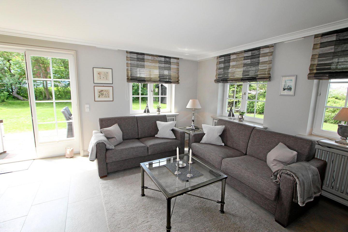 Der stilvoll gestaltete Wohnbereich im Erdgeschoss mit Blick auf den grünen Garten lädt mit zwei schönen Zweisitzern, eine gemütliche Sitzecke formierend, zum Entspannen ein.