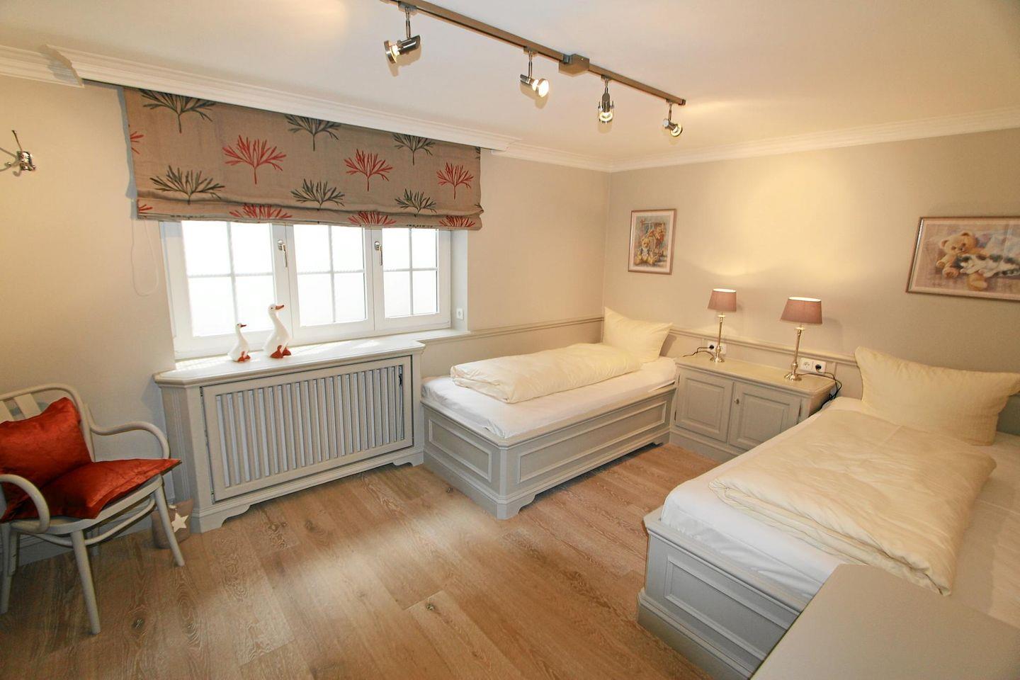 Im Untergeschoss der Ferienwohnung finden Sie zwei Schlafzimmer. Das erste Schlafzimmer verfügt über zwei Einzelbetten und einen geräumigen Kleiderschrank. Ferner finden Sie im zweiten Schlafraum ein Doppelbett und einen Kleiderschrank vor, beide Schlafräume verfügen über ein Fenster mit Tageslicht.