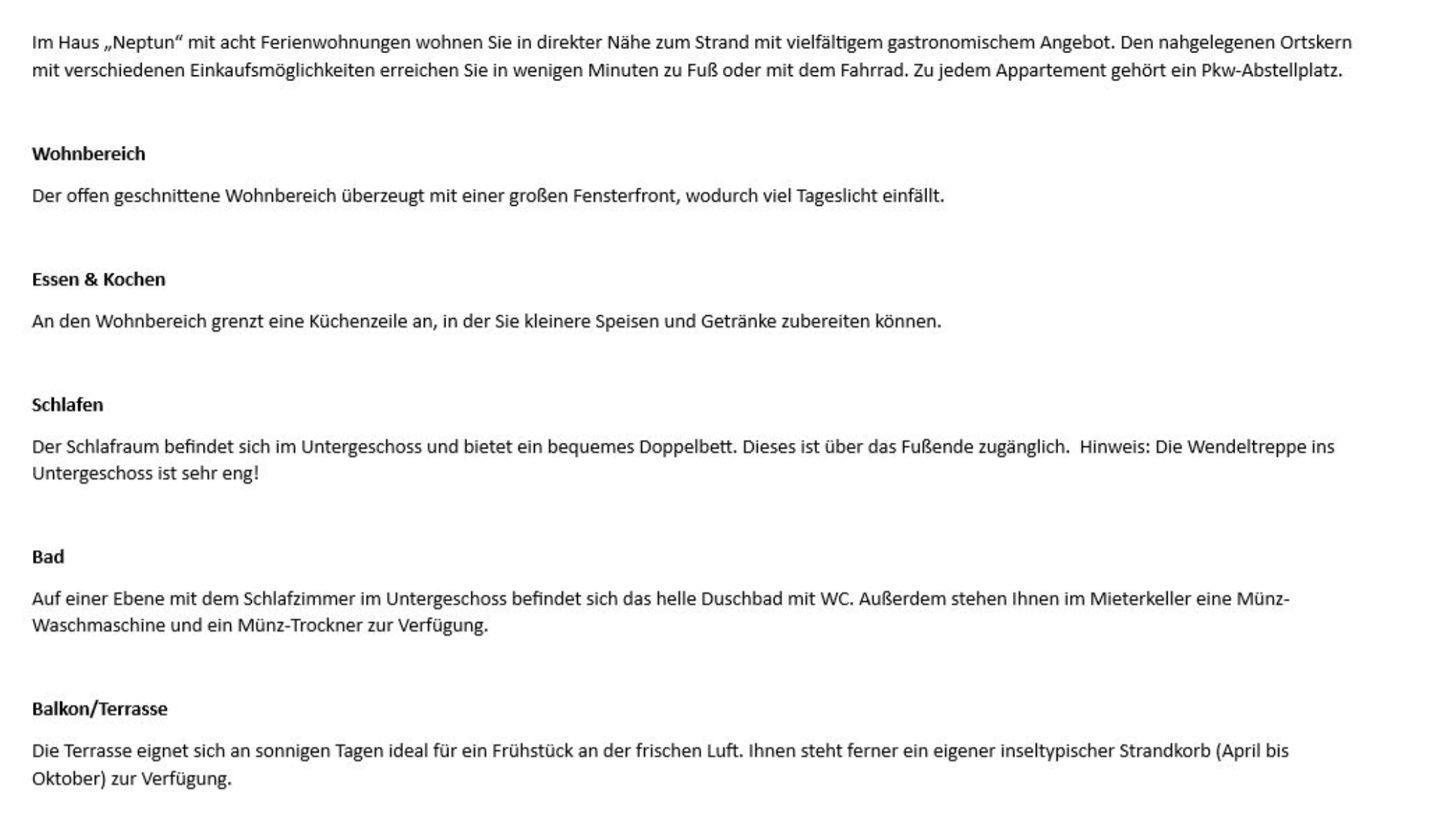 Im Haus „Neptun“ mit acht Ferienwohnungen wohnen Sie in direkter Nähe zum Strand mit vielfältigem gastronomischem Angebot. Den nahgelegenen Ortskern mit verschiedenen Einkaufsmöglichkeiten erreichen Sie in wenigen Minuten zu Fuß oder mit dem Fahrrad. Zu jedem Appartement gehört ein Pkw-Abstellplatz.