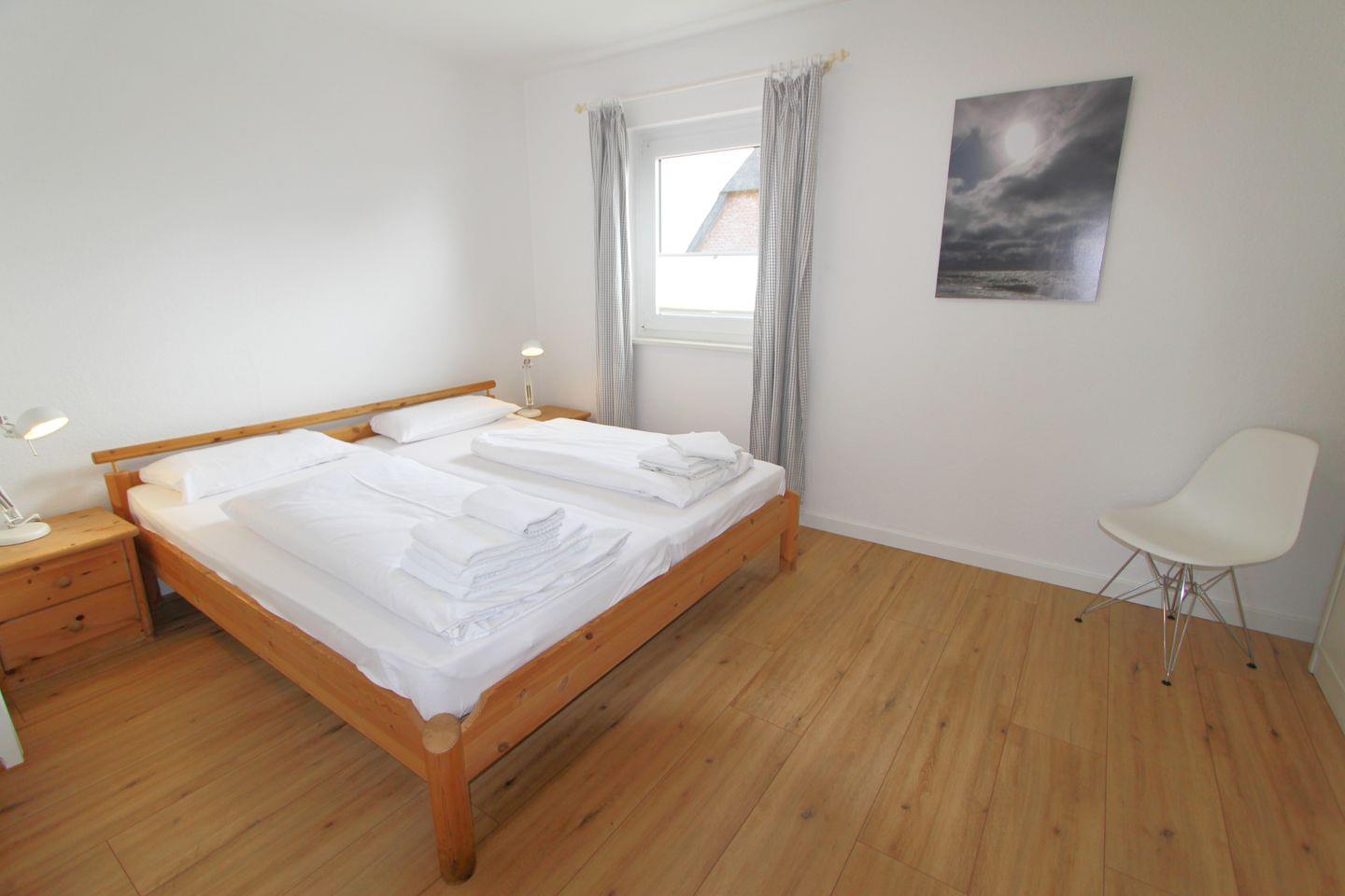 Das Schlafzimmer ist schlicht und funktional eingerichtet und bietet neben einem geräumigen Kleiderschrank ein komfortables Doppelbett und ein Fenster zur Ostseite, sodass Sie mit den ersten Sonnenstrahlen des Tages erwachen.