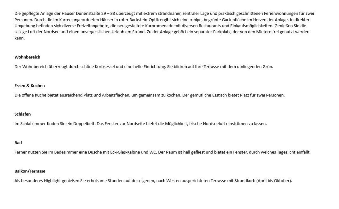 Die gepflegte Anlage der Häuser Dünenstraße 29 – 33 überzeugt mit extrem strandnaher, zentraler Lage und praktisch geschnittenen Ferienwohnungen für zwei Personen. Durch die im Karree angeordneten Häuser in roter Backstein-Optik ergibt sich eine ruhige, begrünte Gartenfläche im Herzen der Anlage. In direkter Umgebung befinden sich diverse Freizeitangebote, die neu gestaltete Kurpromenade mit diversen Restaurants und Einkaufsmöglichkeiten. Genießen Sie die salzige Luft der Nordsee und einen unvergesslichen Urlaub am Strand. Zu der Anlage gehört ein separater Parkplatz, der von den Mietern frei genutzt werden kann.