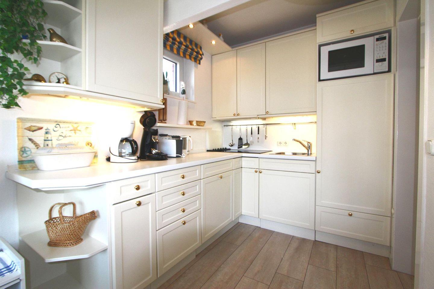 Die offene Küche bietet ausreichend Platz und Arbeitsflächen, um gemeinsam zu kochen. Der gemütliche Esstisch bietet Platz für zwei Personen.