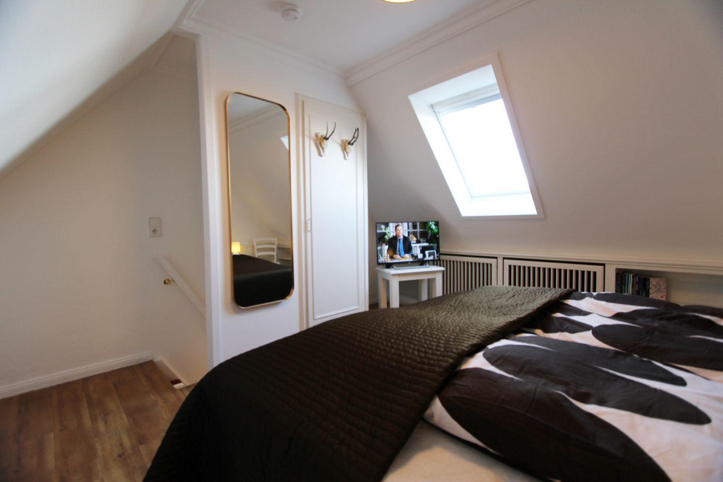 Zum einen steht Ihnen ein Doppelschlafraum im Obergeschoss zur Verfügung. Hinzu kommt ein sehr großer Schlafraum mit Doppelbett im Dachgeschoss. Hier verfügen Sie über ein weiteres TV-Gerät. In beiden Schlafzimmern profitieren Sie von großen Einbauschränken. Die Treppe zum 2. Schlafzimmer ist steiler als normal.