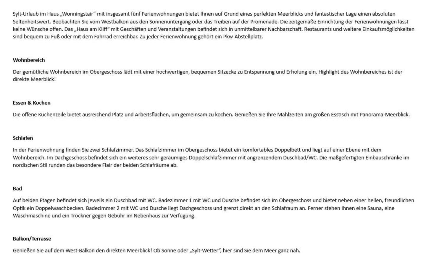 Sylt-Urlaub im Haus „Wonningstair“ mit insgesamt fünf Ferienwohnungen bietet Ihnen auf Grund eines perfekten Meerblicks und fantastischer Lage einen absoluten Seltenheitswert. Beobachten Sie vom Westbalkon aus den Sonnenuntergang oder das Treiben auf der Promenade. Die zeitgemäße Einrichtung der Ferienwohnungen lässt keine Wünsche offen. Das „Haus am Kliff“ mit Geschäften und Veranstaltungen befindet sich in unmittelbarer Nachbarschaft. Restaurants und weitere Einkaufsmöglichkeiten sind bequem zu Fuß oder mit dem Fahrrad erreichbar. Zu jeder Ferienwohnung gehört ein Pkw-Abstellplatz.