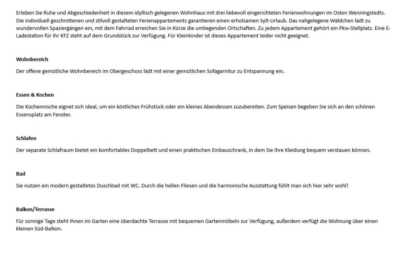Erleben Sie Ruhe und Abgeschiedenheit in diesem idyllisch gelegenen Wohnhaus mit drei liebevoll eingerichteten Ferienwohnungen im Osten Wenningstedts. Die individuell geschnittenen und stilvoll gestalteten Ferienappartements garantieren einen erholsamen Sylt-Urlaub. Das nahgelegene Wäldchen lädt zu wundervollen Spaziergängen ein, mit dem Fahrrad erreichen Sie in Kürze die umliegenden Ortschaften. Zu jedem Appartement gehört ein Pkw-Stellplatz. Eine E-Ladestation für Ihr KFZ steht auf dem Grundstück zur Verfügung. Für Kleinkinder ist dieses Appartement leider nicht geeignet.