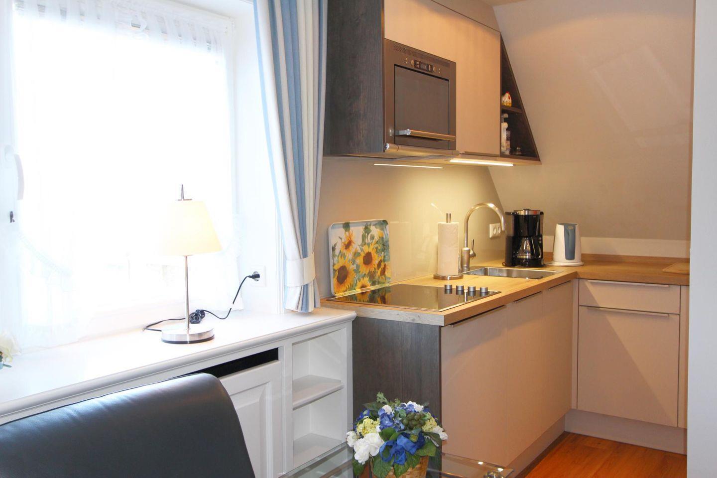 Die Küchennische eignet sich ideal, um ein köstliches Frühstück oder ein kleines Abendessen zuzubereiten. Zum Speisen begeben Sie sich an den schönen Essensplatz am Fenster.