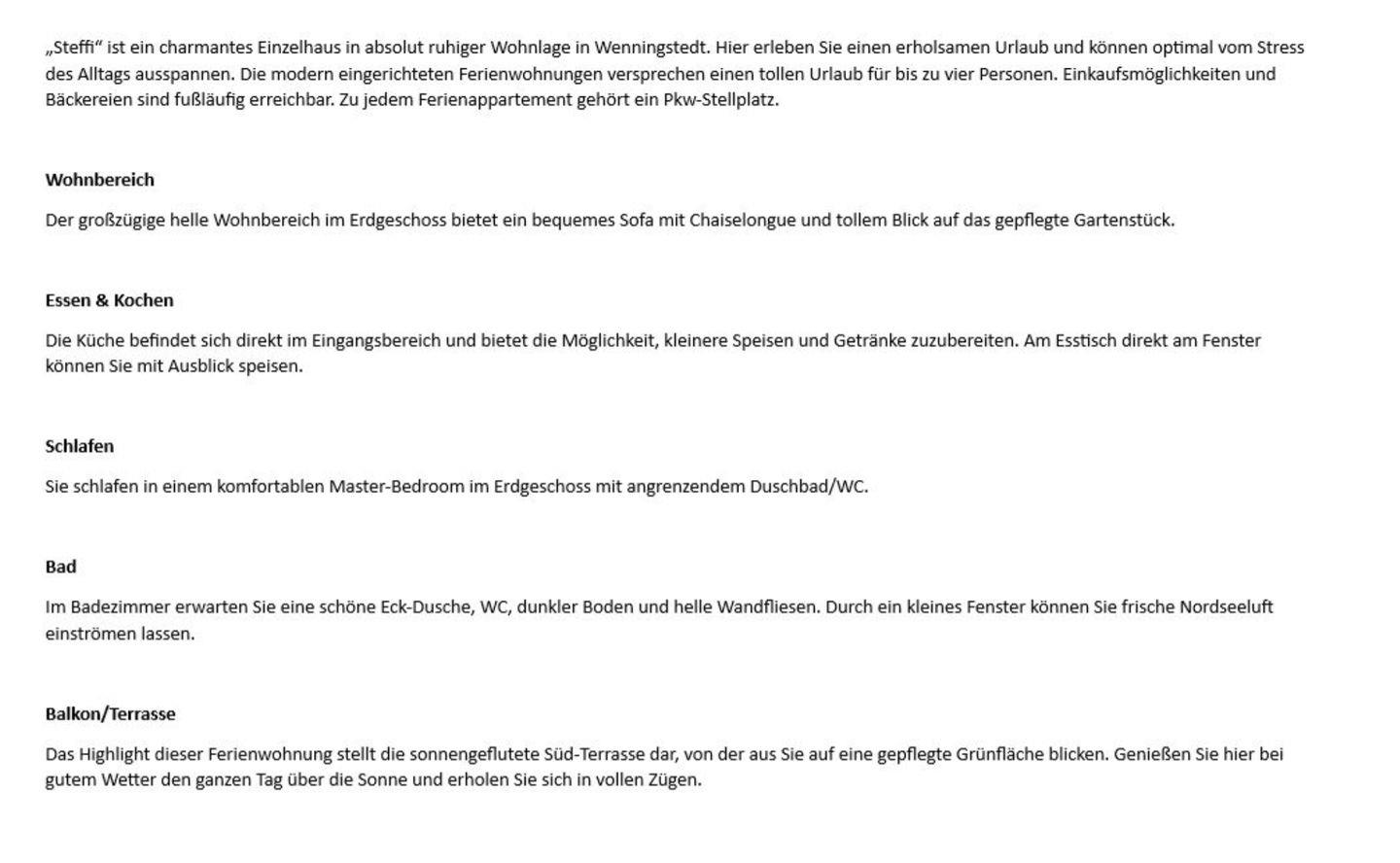 „Steffi“ ist ein charmantes Einzelhaus in absolut ruhiger Wohnlage in Wenningstedt. Hier erleben Sie einen erholsamen Urlaub und können optimal vom Stress des Alltags ausspannen. Die modern eingerichteten Ferienwohnungen versprechen einen tollen Urlaub für bis zu vier Personen. Einkaufsmöglichkeiten und Bäckereien sind fußläufig erreichbar. Zu jedem Ferienappartement gehört ein Pkw-Stellplatz.