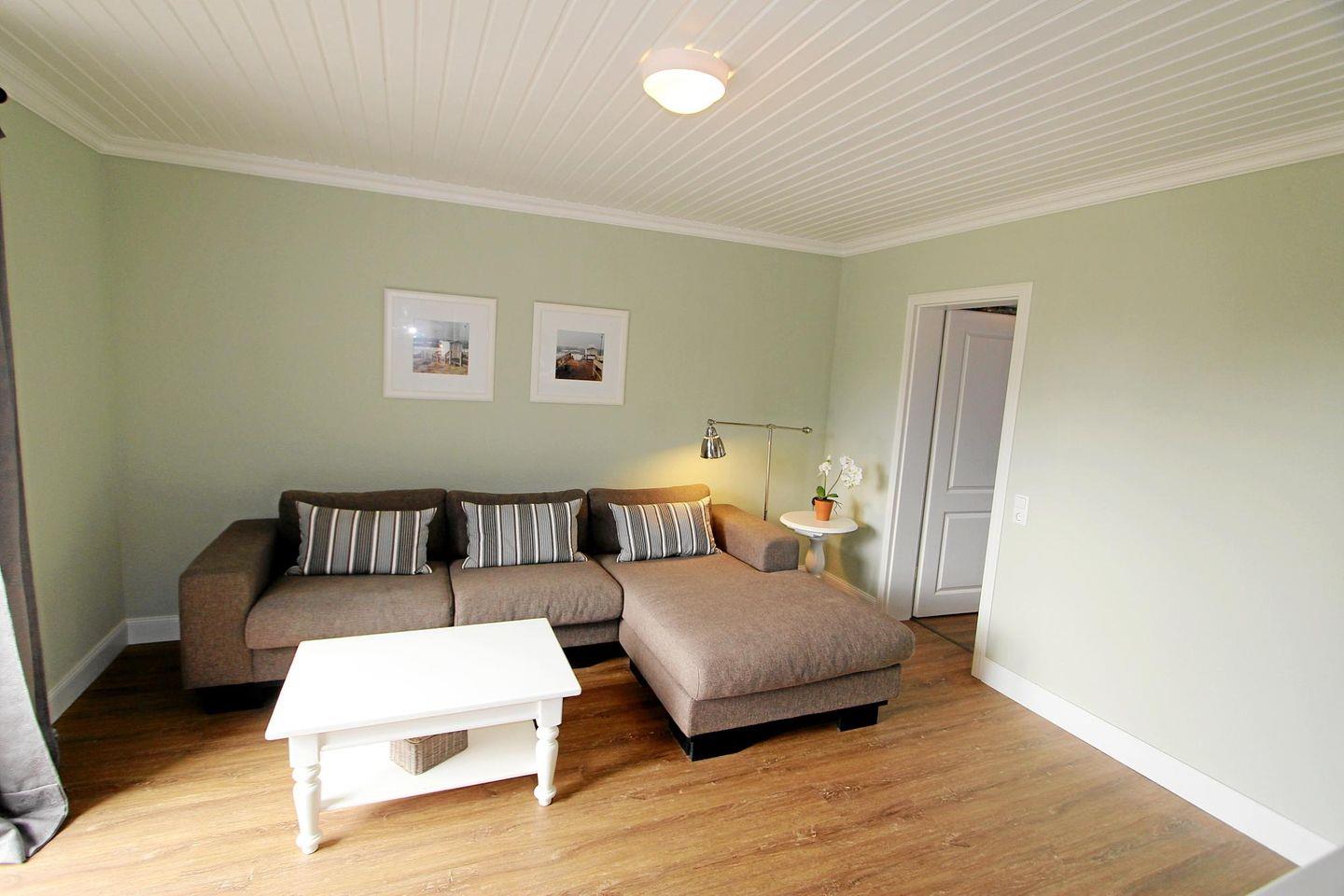 Der großzügige helle Wohnbereich im Erdgeschoss bietet ein bequemes Sofa mit Chaiselongue und tollem Blick auf das gepflegte Gartenstück.