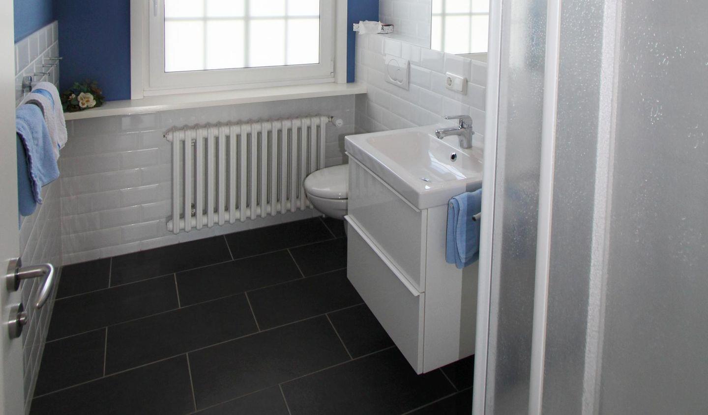 Im kleinen feinen Badezimmer stehen Ihnen Dusche und WC zur Verfügung. Es ist modern gestaltet – dunkler Fußboden, helle Wandfliesen.