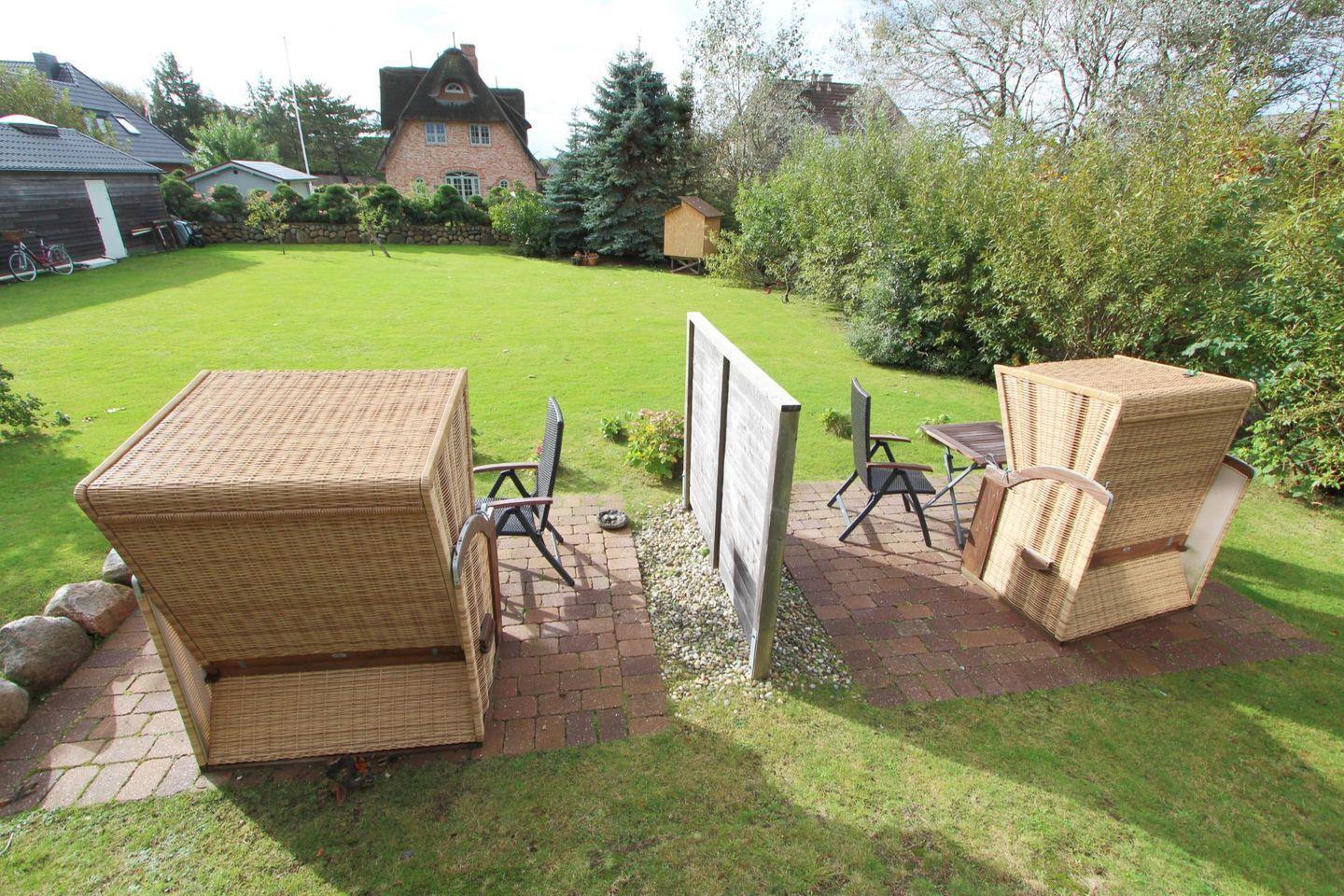 Zur Wohnung selbst gehört kein Balkon, dafür steht Ihnen aber eine schöne Sitzecke mit Strandkorb im Garten zur freien Nutzung bereit. Hier können Sie gemütlich ein Frühstück unter freiem Himmel genießen.