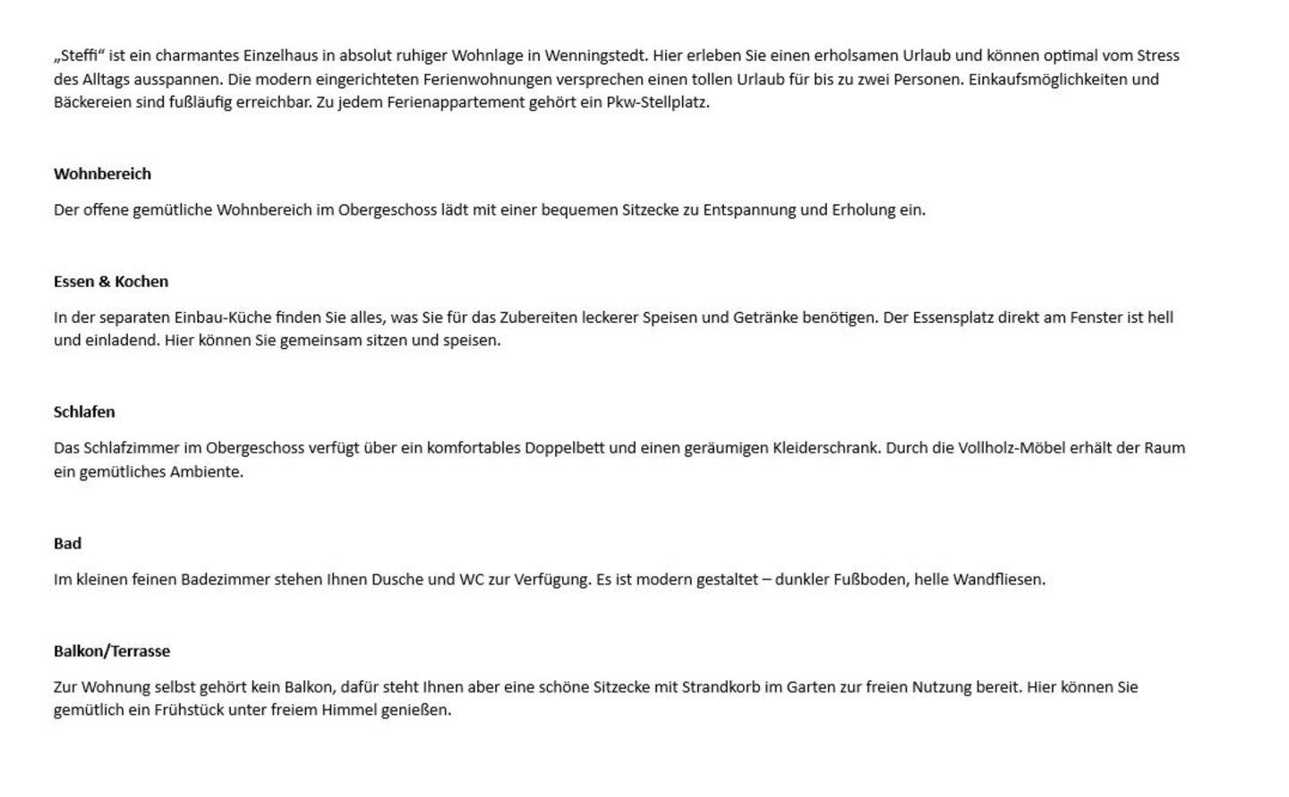 „Steffi“ ist ein charmantes Einzelhaus in absolut ruhiger Wohnlage in Wenningstedt. Hier erleben Sie einen erholsamen Urlaub und können optimal vom Stress des Alltags ausspannen. Die modern eingerichteten Ferienwohnungen versprechen einen tollen Urlaub für bis zu zwei Personen. Einkaufsmöglichkeiten und Bäckereien sind fußläufig erreichbar. Zu jedem Ferienappartement gehört ein Pkw-Stellplatz.