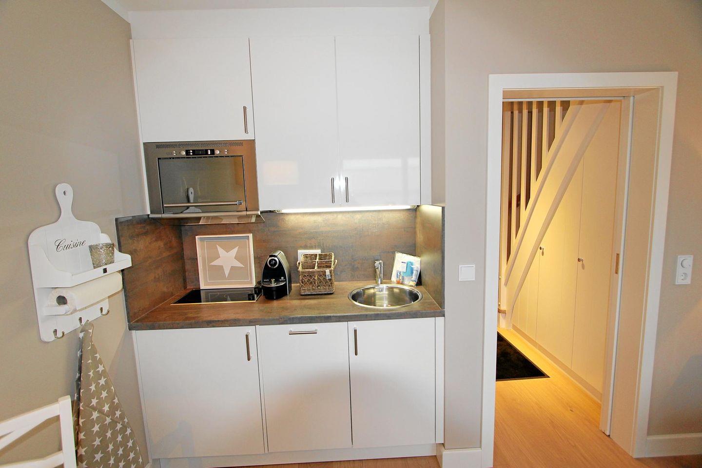 In der Küchenzeile können kleinere Speisen und Getränke zubereitet werden. Der morgendliche Kaffee ist hier gesichert. Am hellen Essensplatz kann gegessen werden.