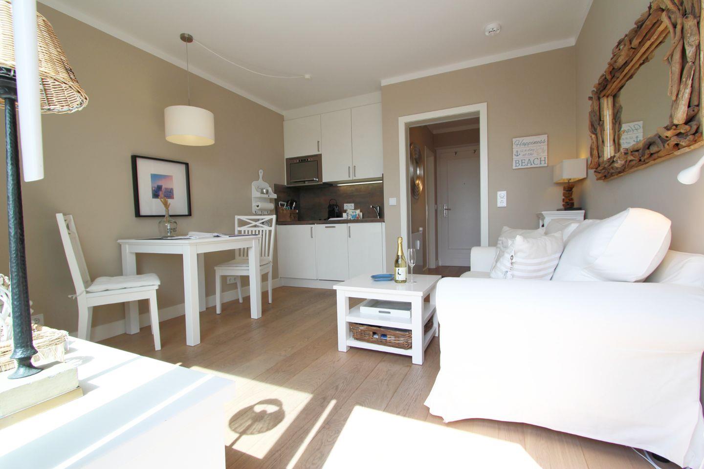 Der Wohnbereich im 2. Obergeschoss überzeugt mit seinem Ambiente im Hamptons-Stil. Entspannen Sie auf dem gemütlichen Zweisitzer. Gekonnt gesetzte Details aus maritimen Stilelementen runden den Charme des Wohnbereichs ab.