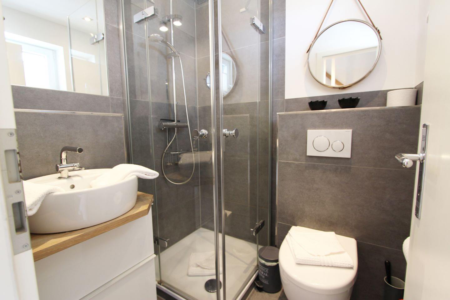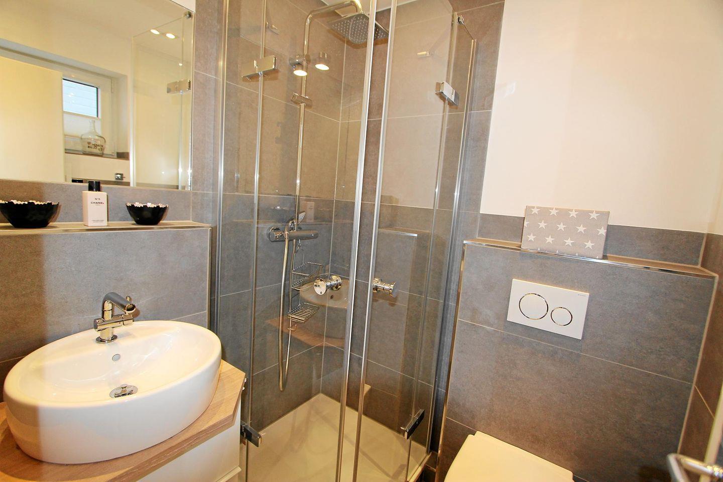 Das moderne Duschbad mit WC im Eingangsbereich der Wohnung führt den edlen Stil der Ferienwohnung fort. Außerdem stehen Ihnen eine Münz-Waschmaschine und ein Münz-Trockner im Mieterkeller zur Verfügung.