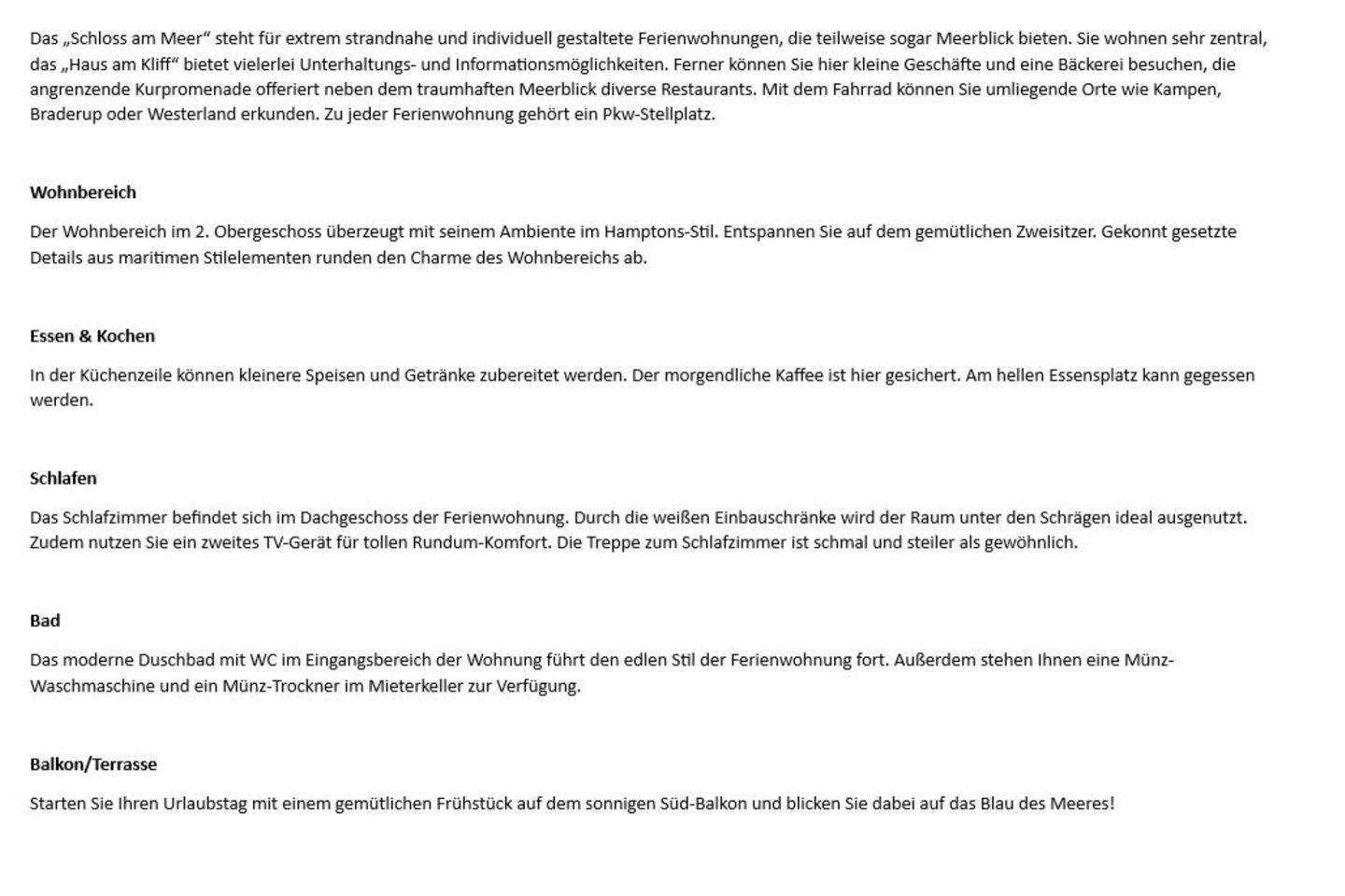 Das „Schloss am Meer“ steht für extrem strandnahe und individuell gestaltete Ferienwohnungen, die teilweise sogar Meerblick bieten. Sie wohnen sehr zentral, das „Haus am Kliff“ bietet vielerlei Unterhaltungs- und Informationsmöglichkeiten. Ferner können Sie hier kleine Geschäfte und eine Bäckerei besuchen, die angrenzende Kurpromenade offeriert neben dem traumhaften Meerblick diverse Restaurants. Mit dem Fahrrad können Sie umliegende Orte wie Kampen, Braderup oder Westerland erkunden. Zu jeder Ferienwohnung gehört ein Pkw-Stellplatz.