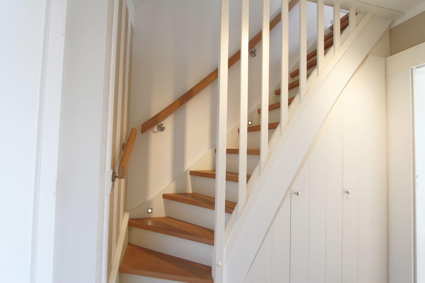 Das Schlafzimmer befindet sich im Dachgeschoss der Ferienwohnung. Durch die weißen Einbauschränke wird der Raum unter den Schrägen ideal ausgenutzt. Zudem nutzen Sie ein zweites TV-Gerät für tollen Rundum-Komfort. Die Treppe zum Schlafzimmer ist schmal und steiler als gewöhnlich.