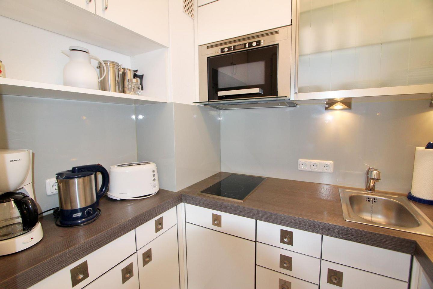 Die Kochnische eignet sich ideal zum Zubereiten des Leibgerichts oder eines erfrischenden Getränks. Hierfür ist die Küche modern und hochwertig ausgestattet.