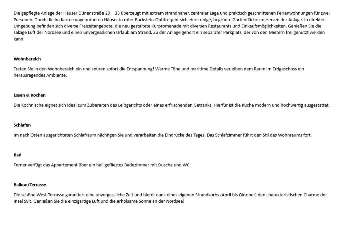 Die gepflegte Anlage der Häuser Dünenstraße 29 – 33 überzeugt mit extrem strandnaher, zentraler Lage und praktisch geschnittenen Ferienwohnungen für zwei Personen. Durch die im Karree angeordneten Häuser in roter Backstein-Optik ergibt sich eine ruhige, begrünte Gartenfläche im Herzen der Anlage. In direkter Umgebung befinden sich diverse Freizeitangebote, die neu gestaltete Kurpromenade mit diversen Restaurants und Einkaufsmöglichkeiten. Genießen Sie die salzige Luft der Nordsee und einen unvergesslichen Urlaub am Strand. Zu der Anlage gehört ein separater Parkplatz, der von den Mietern frei genutzt werden kann.